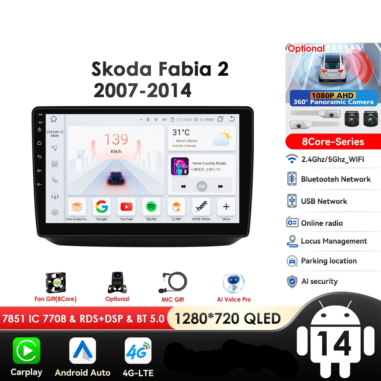 Skoda Fabia 2 2007 - 2014 10,1" Android 14 Carplay Android auto wireless wifi bt gps 4g AUTMQ1FL