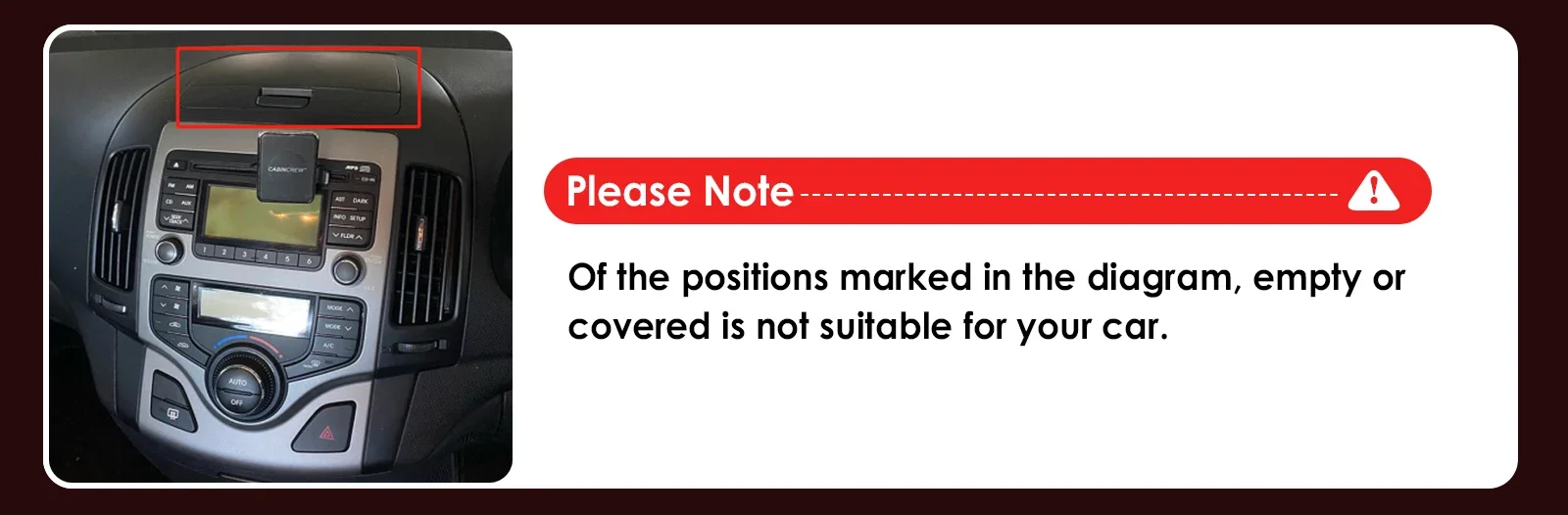Se la parte superiore del cruscotto (indicata nel riquadro rosso) è vuota o coperta , il modello non è compatibile con la tua auto .