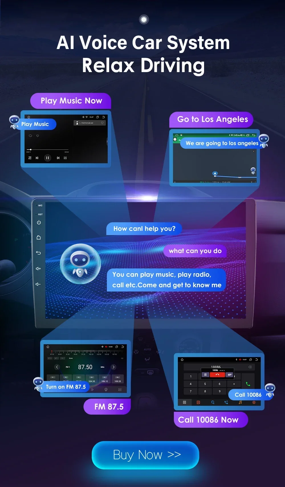Sicurezza AI: la funzione di sicurezza AI consente di controllare l'allarme della recinzione elettrica e di scattare una foto dal DVR quando il dispositivo è acceso per vedere cosa si trova nelle vicinanze del veicolo (questa funzione richiede l'acquisto di un DVR 1080P da noi). Sistema di guida AI Voice Car Relax (da acquistare separatamente) Pacchetto assistente intelligente AI : il nostro pacchetto di assistente intelligente AI include l'assistente vocale AI Pro, per le radio della serie S S3, S4, S5, S7, S8 aggiungerà queste funzioni: tracciamento della traccia, posizione di imballaggio e funzioni radio online. Bluetooth 5.0 Dual Channel: connessione Bluetooth stabile e a lunga distanza. Connessione WIFI stabile e a lunga distanza. (Sulla sua interfaccia principale può mostrare "Visualizzazione del modello della batteria del telefono")