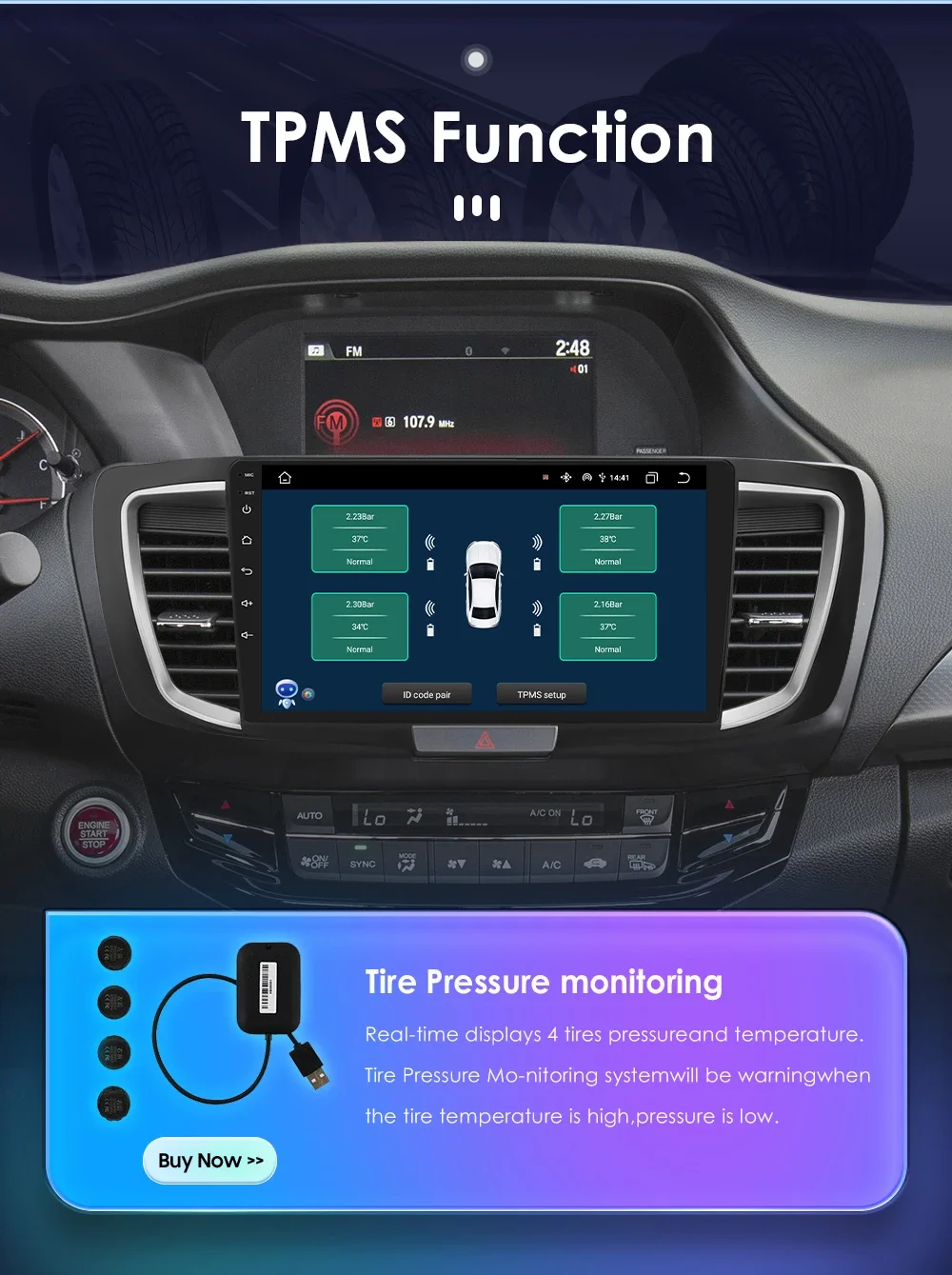 Funzione TPMS (da ordinare separatamente): monitoraggio della pressione dei pneumatici: visualizza in tempo reale la pressione e la temperatura di 4 pneumatici, il sistema di monitoraggio della pressione dei pneumatici avvisa quando la temperatura dei pneumatici è alta o la pressione è bassa.