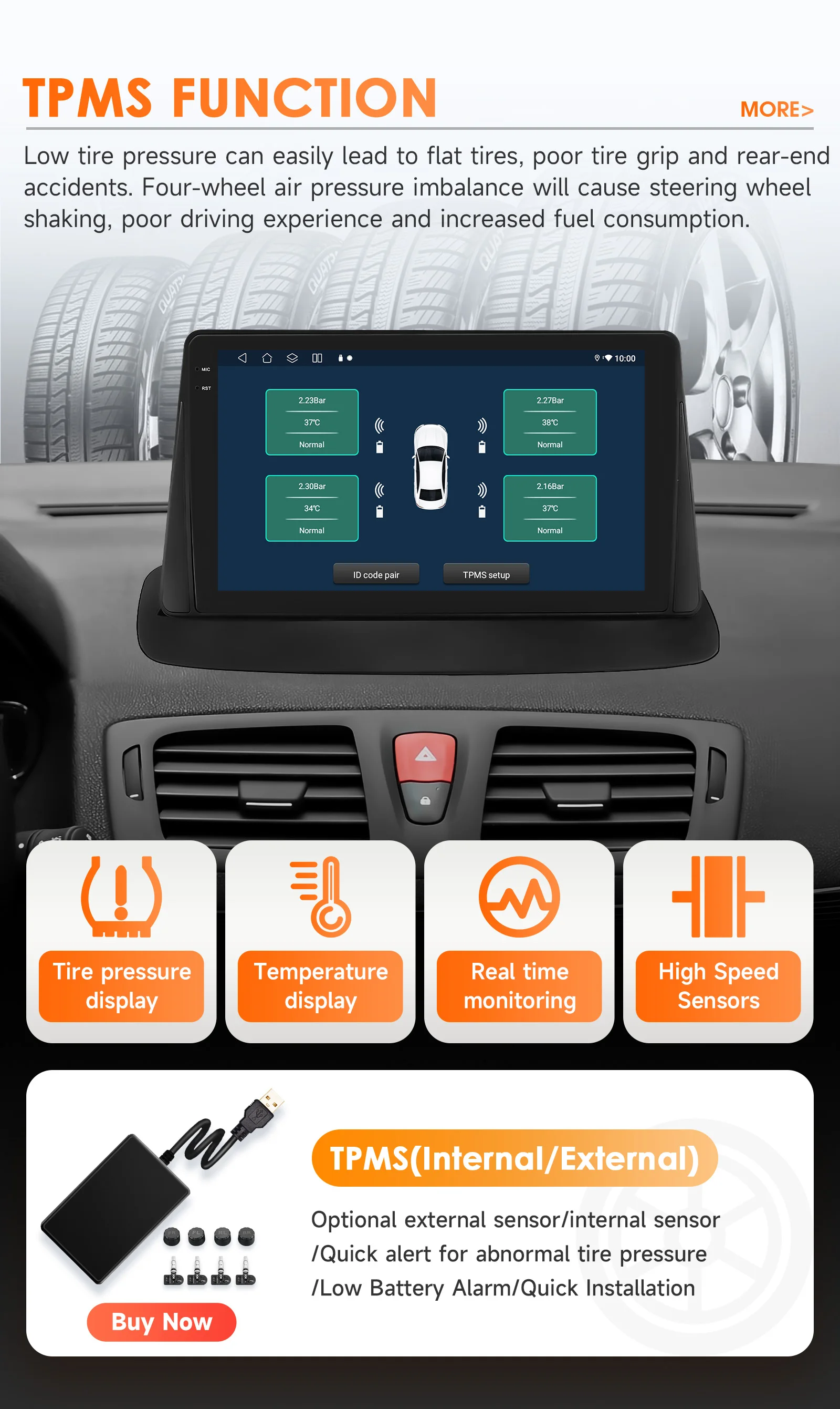 Low tire pressure can easily lead to flat tires, poor tire grip and rear-endaccidents. Four-wheel air pressure imbalance will cause steering wheelshaking,poor driving experience and increased fuel consumption.