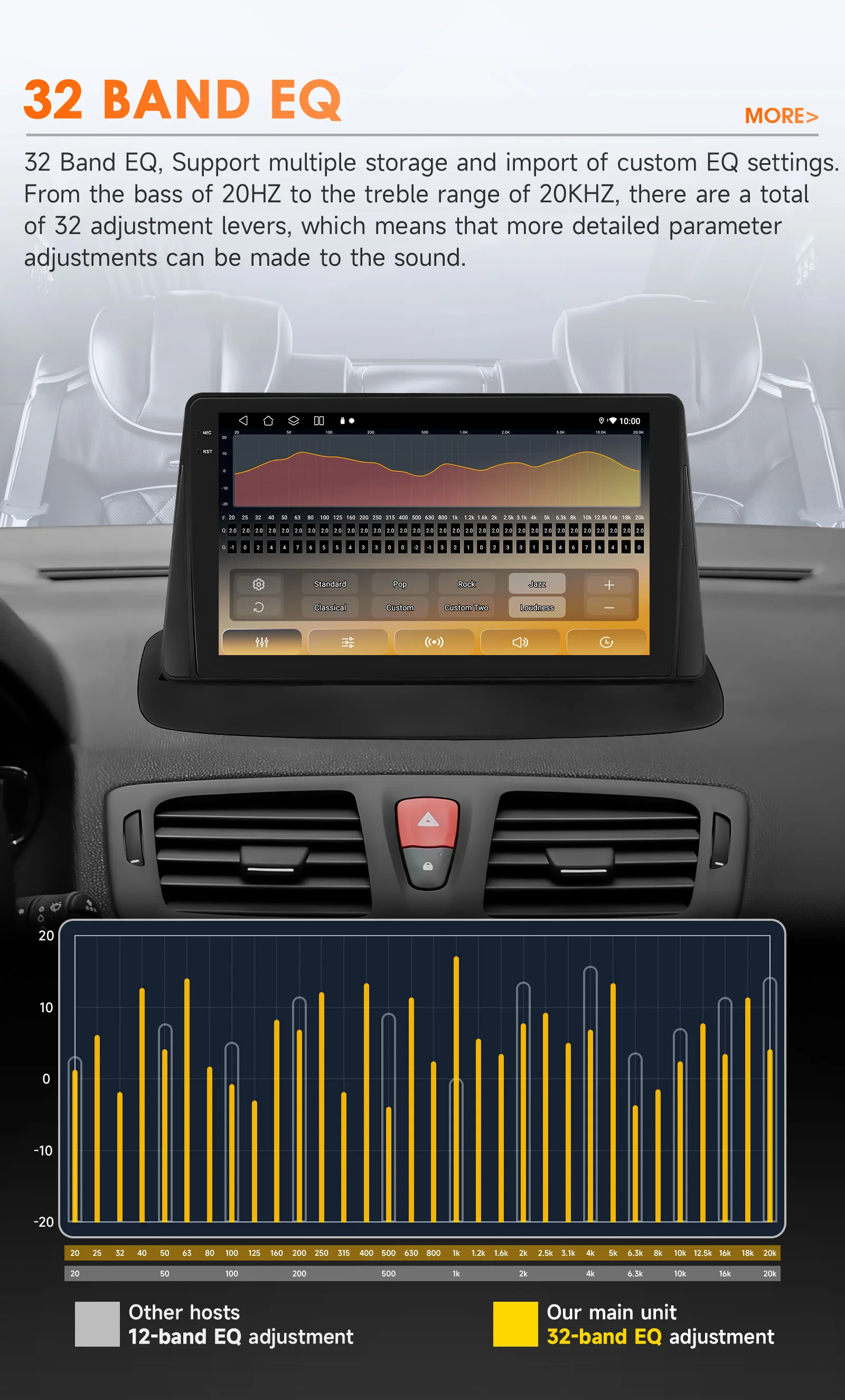 32 Band EQ,Support multiple storage and import of custom EQ settings.From the bass of 20HZ to the treble range of 20KHZ, there are a total of 32 adjustment levers, which means that more detailed parameter adjustments can be made to the sound.