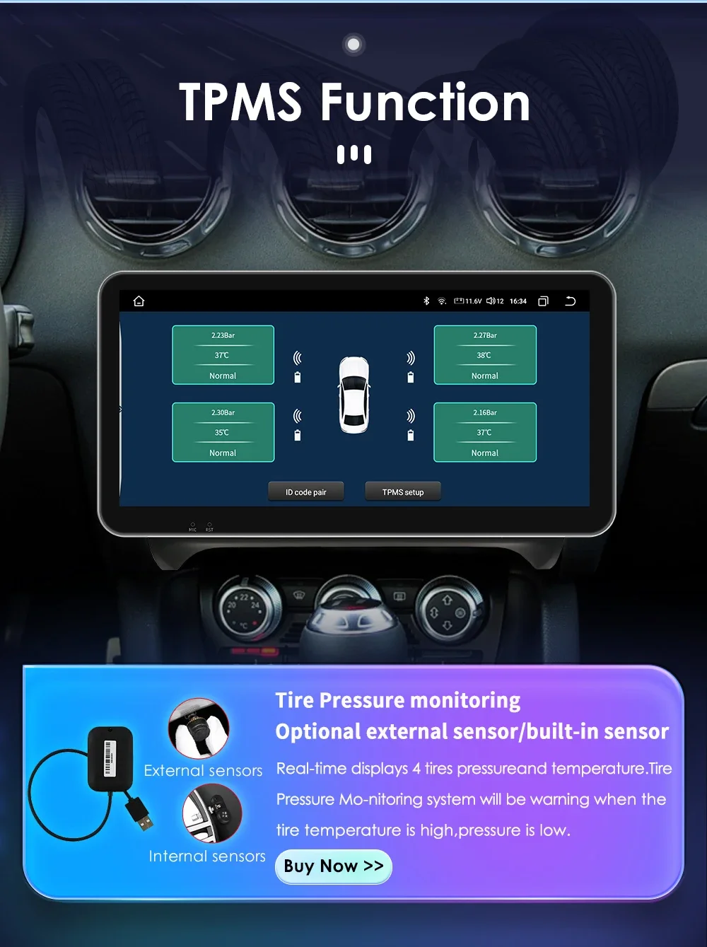TPMS Function( Needs to order separately) : Tire Pressure Monitoring: Real-time displays 4 tires pressure and temperature,Tire Pressure Monitoring system will be warning when the tire temperature is high, pressure is low.