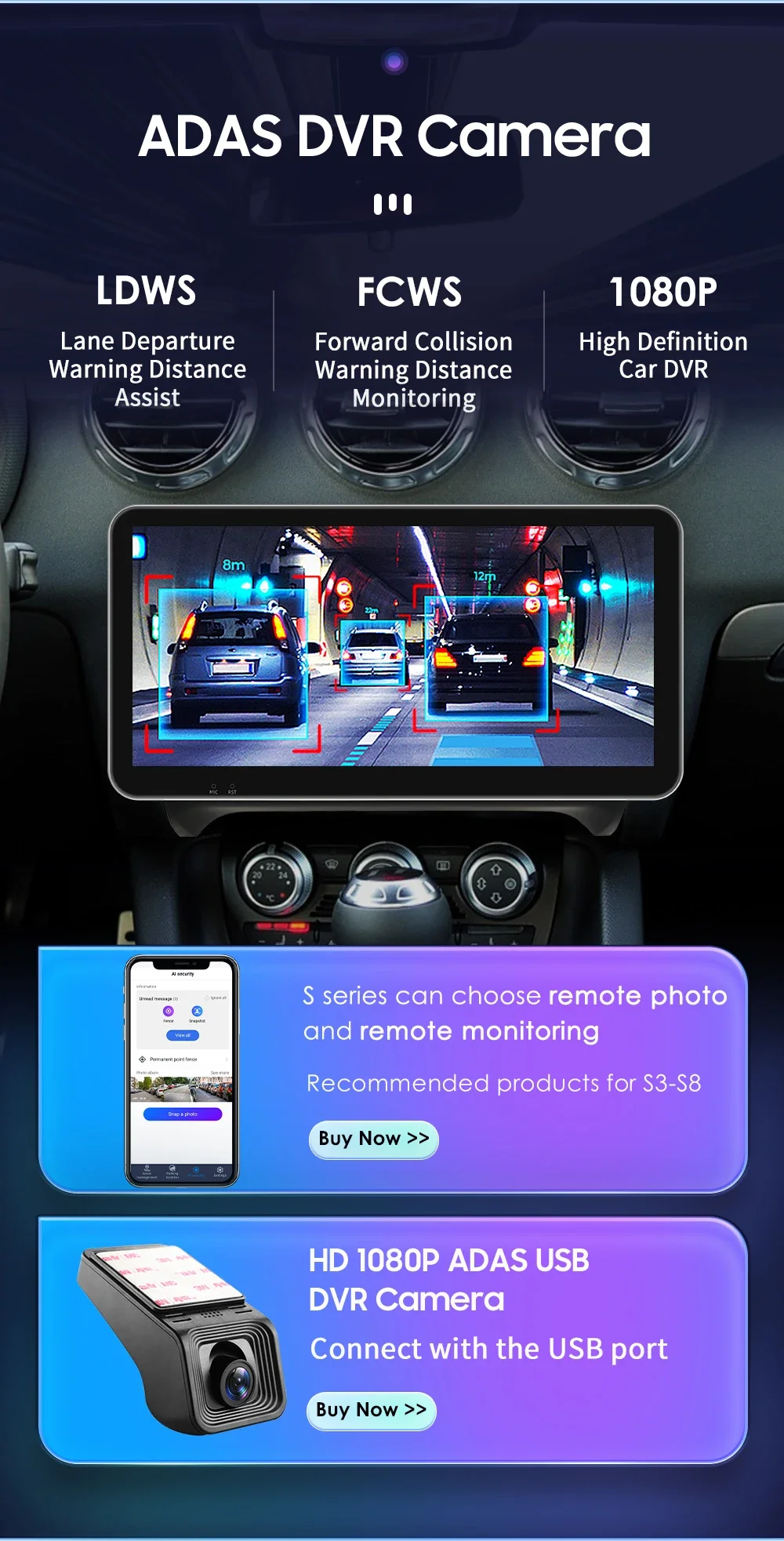 HD 1080P ADAS DVR Camera(Needs to order separately) --connect with the USB port: LDWS(Lane Departure Warning Distance),FCWS(Forward Collision Warning Distance), 1080P(High Definition Car DVR).