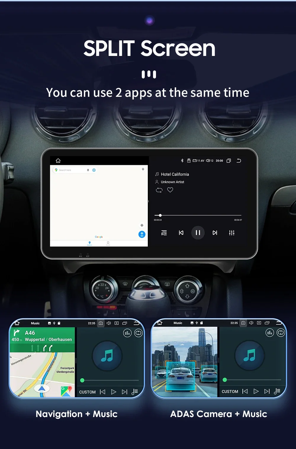 Split Screen : You can use 2 apps at the same time (such as: Navigation + Music , ADAS Camera + Music ,etc.)