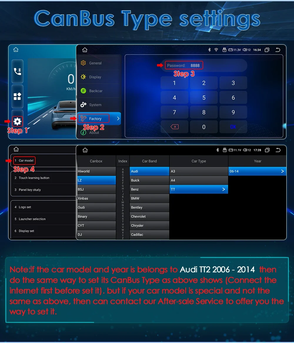 Canbus Type settings: Factory--8888--Car model-- LZ--Audi--TT--06-14--ok.