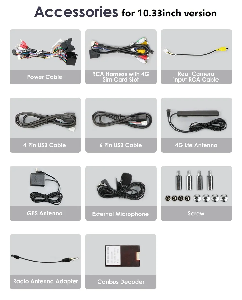 hai due opzioni come nell'immagine seguente tra cui scegliere, una è il tipo di schermo da 10,33 pollici con la seguente prima immagine che mostra gli accessori standard, un'altra è la versione con schermo da 9 pollici / 10,1 pollici con accessori standard (segui la seconda immagine degli accessori). Immagini dei pin del connettore: