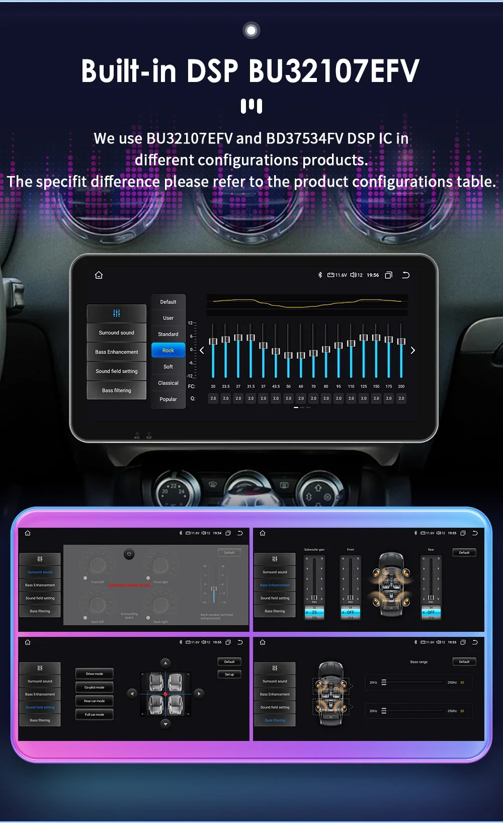 Built-in DSP BU32107EFV: We use BU32107EFV and BD37534FV DSP IC in different configurations products. The specifit difference please refer to the product configurations table.