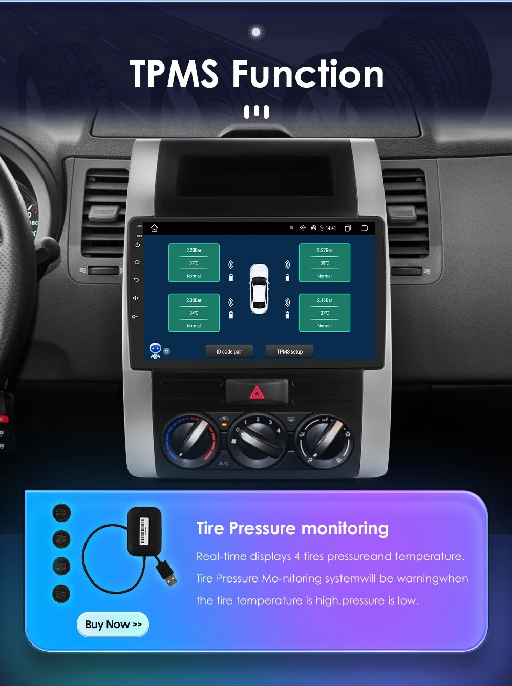 Funzione TPMS (deve essere ordinato separatamente): monitoraggio della pressione dei pneumatici: visualizza in tempo reale la pressione e la temperatura di 4 pneumatici, il sistema di monitoraggio della pressione dei pneumatici avviserà quando la temperatura dei pneumatici è alta, la pressione è bassa.