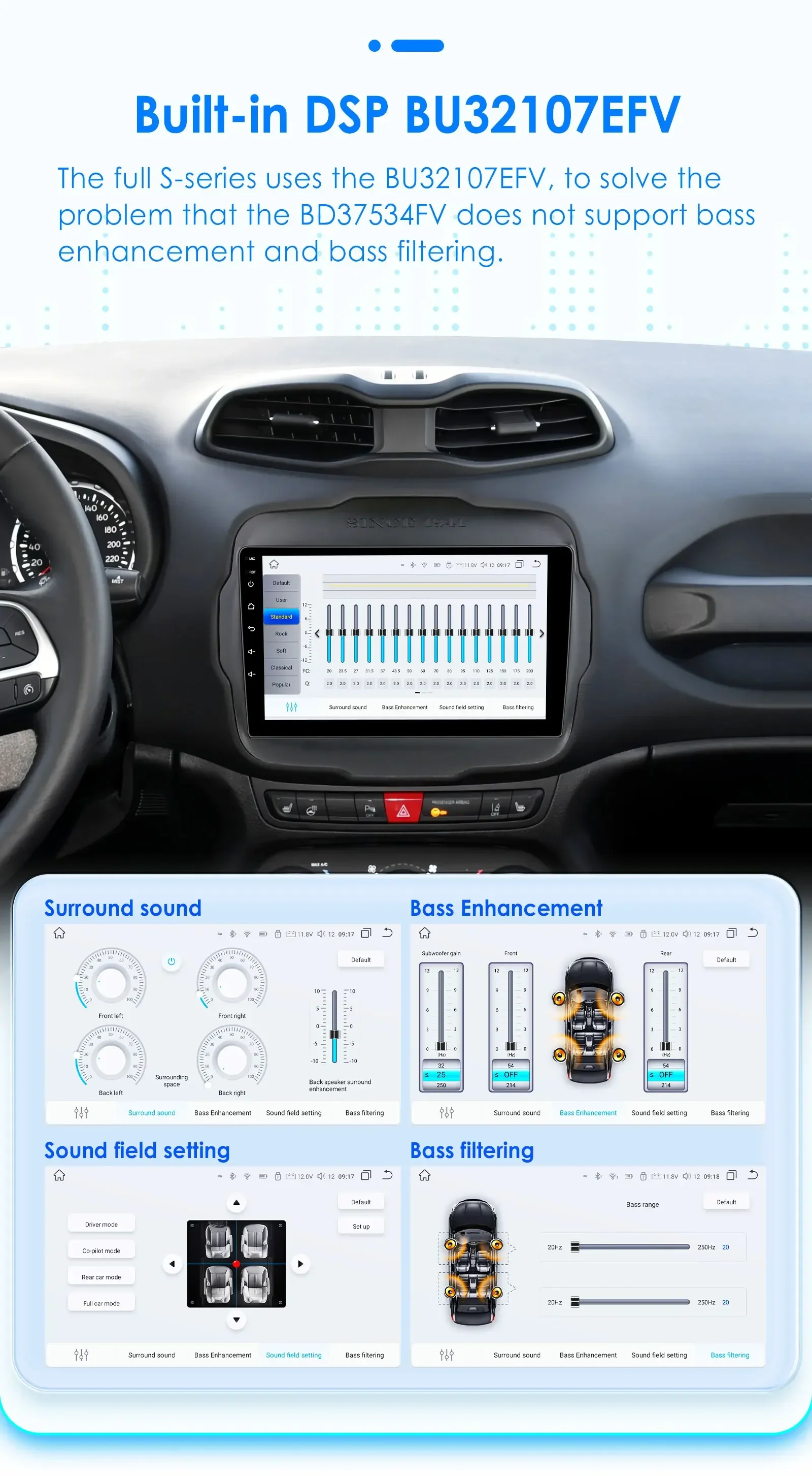 Built-in DSP BU32107EFV: We use BU32107EFV and BD37534FV DSP IC in different configurations products. The specifit difference please refer to the product configurations table.