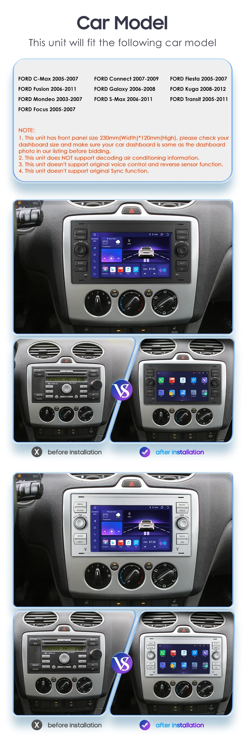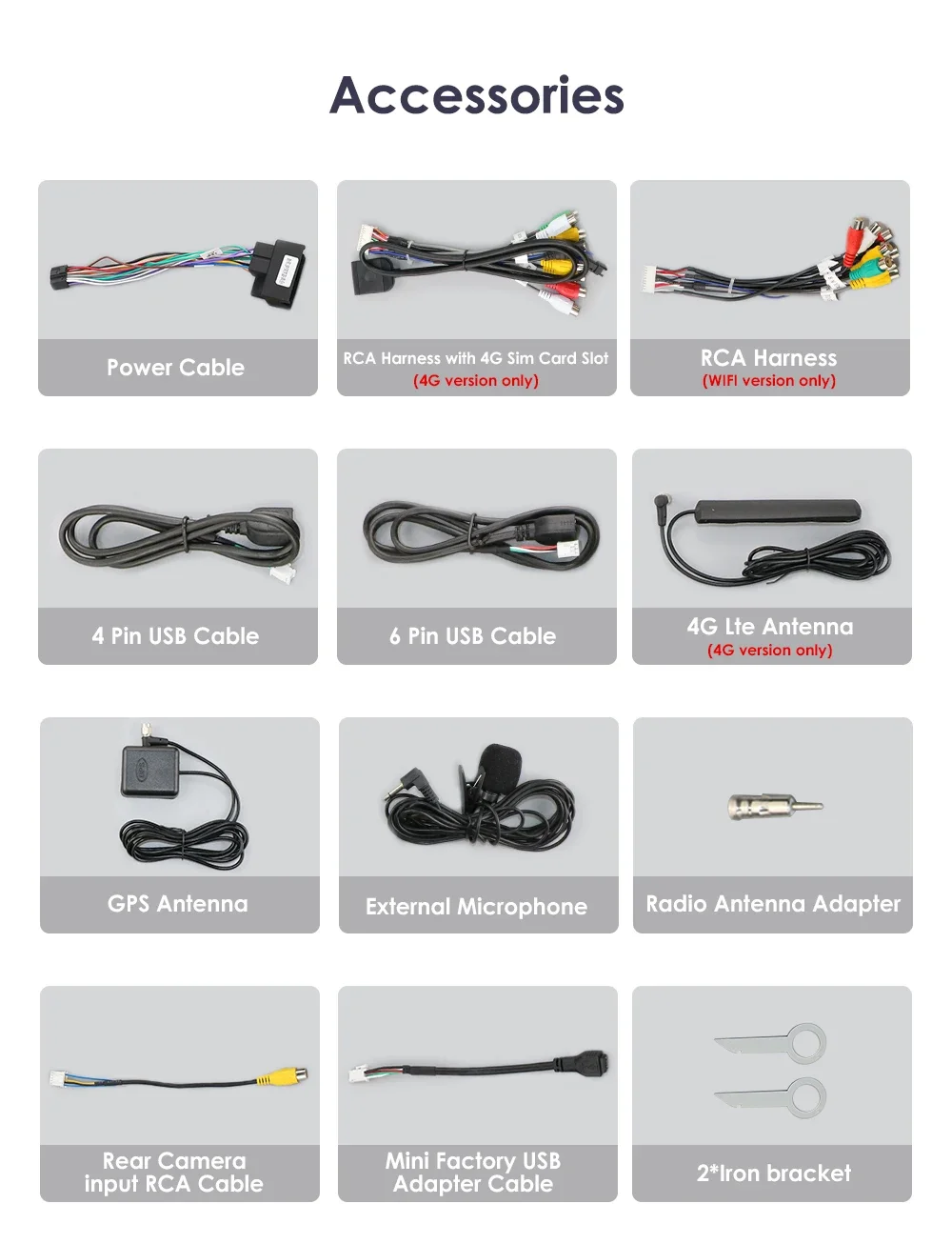 le dimensioni del prodotto: si prega di confrontare con le dimensioni della radio originale prima di fare offerte, se le dimensioni sono diverse e non possono essere installate. Accessori standard: che vengono spediti insieme all'unità principale (ma si prega di prestare attenzione alle parole rosse dell'accessorio se è possibile ottenerlo o meno, il che dipende dall'opzione dell'articolo che si sceglie di acquistare) Immagini dei pin del connettore: (Avviso: se il pin del connettore da installare con il cavo dei cavi dell'auto non è lo stesso, è necessario contattare il servizio post-vendita per ordinare un cavo speciale per l'installazione)