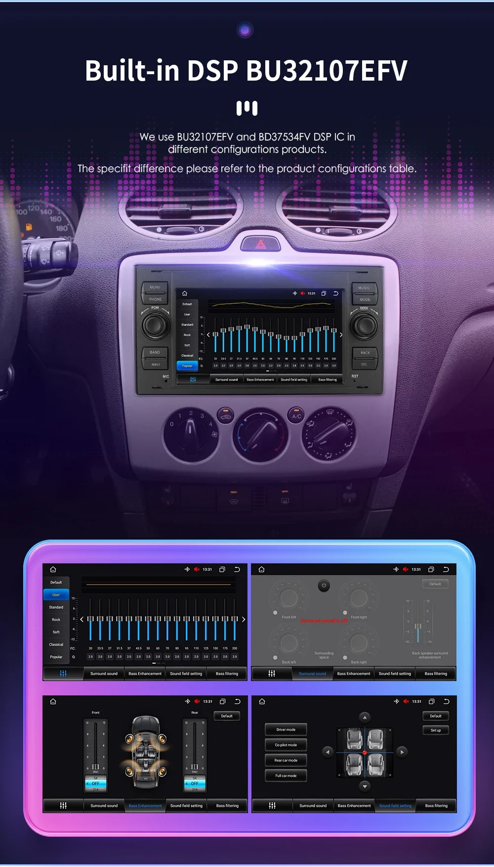 Built-in DSP BU32107EFV: We use BU32107EFV and BD37534FV DSP IC in different configurations products. The specifit difference please refer to the product configurations table.