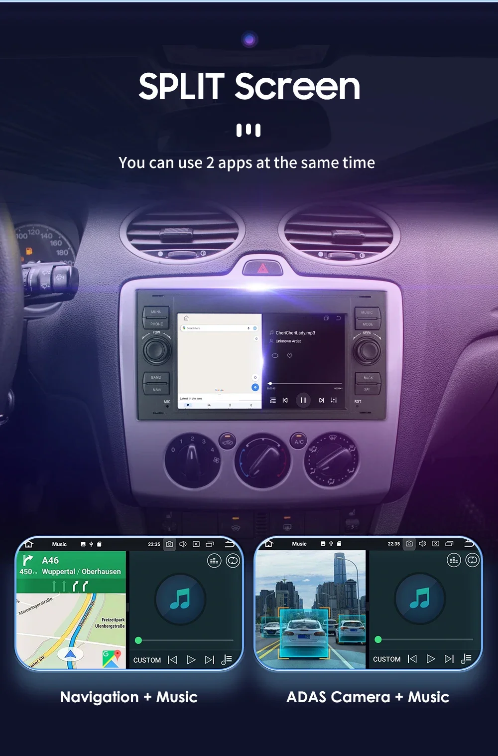 Split Screen : You can use 2 apps at the same time (such as: Navigation + Music , ADAS Camera + Music ,etc.)