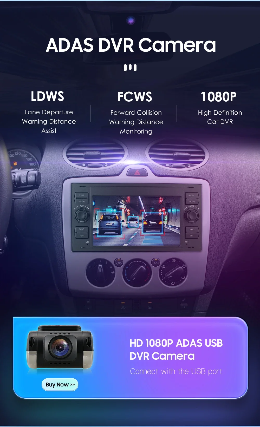HD 1080P ADAS DVR Camera(Needs to order separately) --connect with the USB port: LDWS(Lane Departure Warning Distance),FCWS(Forward Collision Warning Distance), 1080P(High Definition Car DVR).