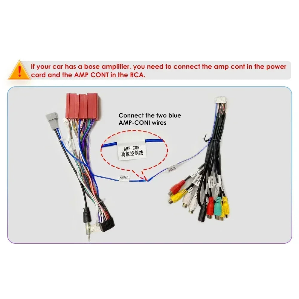 (Nota: se il pin del connettore da installare con il cavo dei cavi dell'auto non è lo stesso, è necessario contattare il servizio post-vendita per ordinare un cavo speciale per l'installazione) Nota: se l'auto è dotata di un amplificatore Bose, è necessario collegare AMP CONT al cavo di alimentazione e AMP Cont all'RCA.