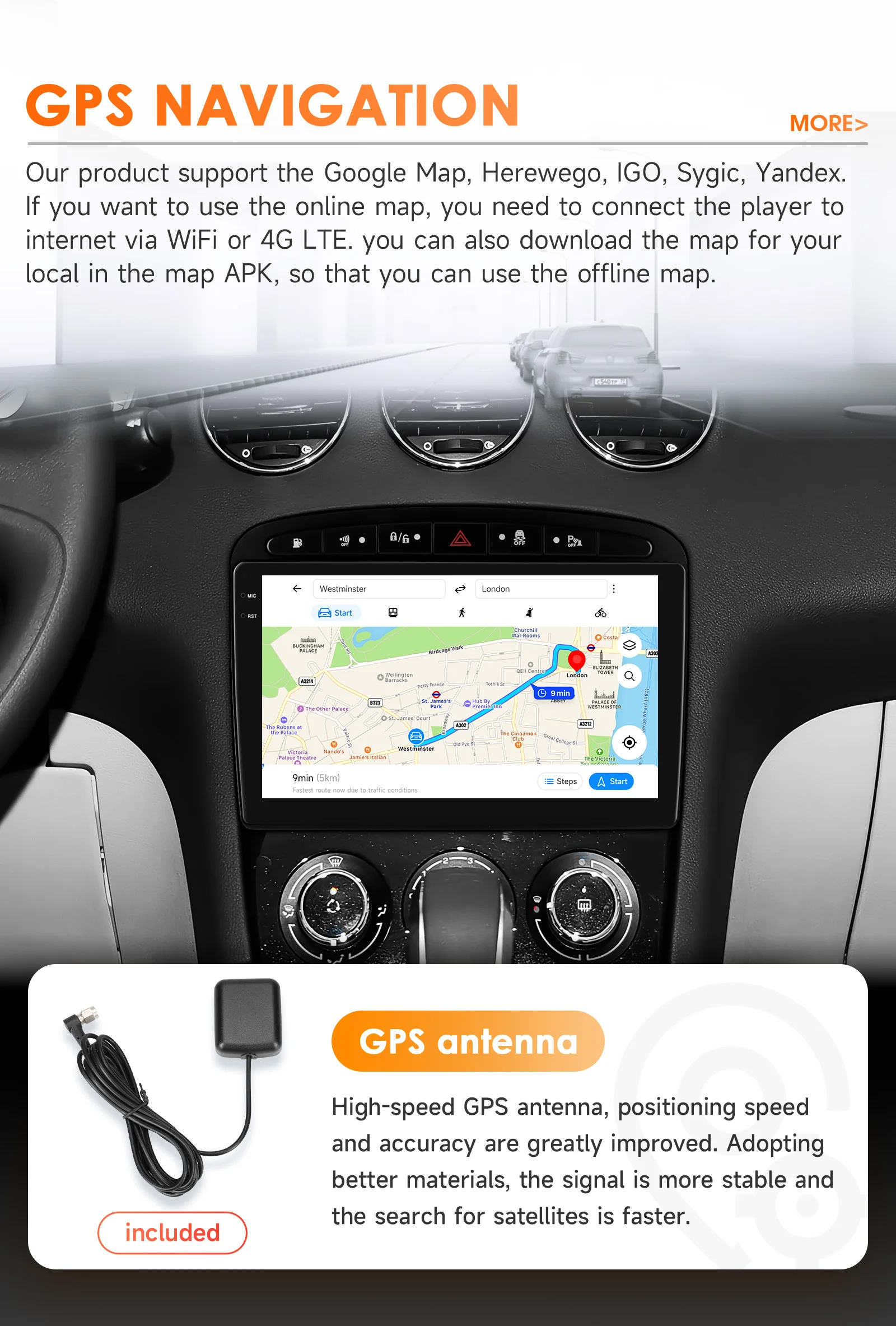 Our product support the Google Map,Herewego,lGO, Sygic, Yandex.lf you want to use the online map, you need to connect the player to internet via WiFi or 4G LTE.you can also download the map for your local in the map APK,so that you can use the offline map.