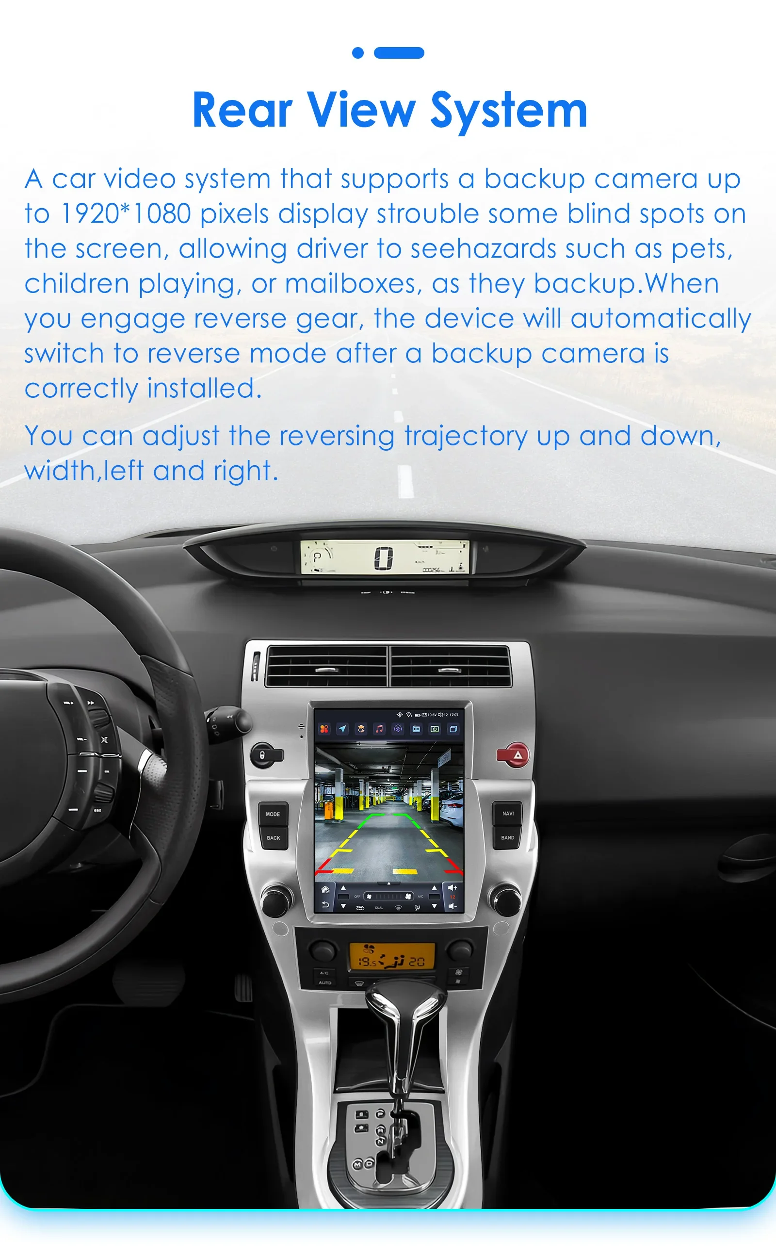 Sistema di visione posteriore (la telecamera per la visione posteriore deve essere ordinata separatamente): un sistema video per auto che supporta una telecamera per la retromarcia visualizza i punti ciechi problematici su un monitor, consentendo al conducente di vedere pericoli come animali domestici, bambini che giocano o cassette della posta mentre fa retromarcia.