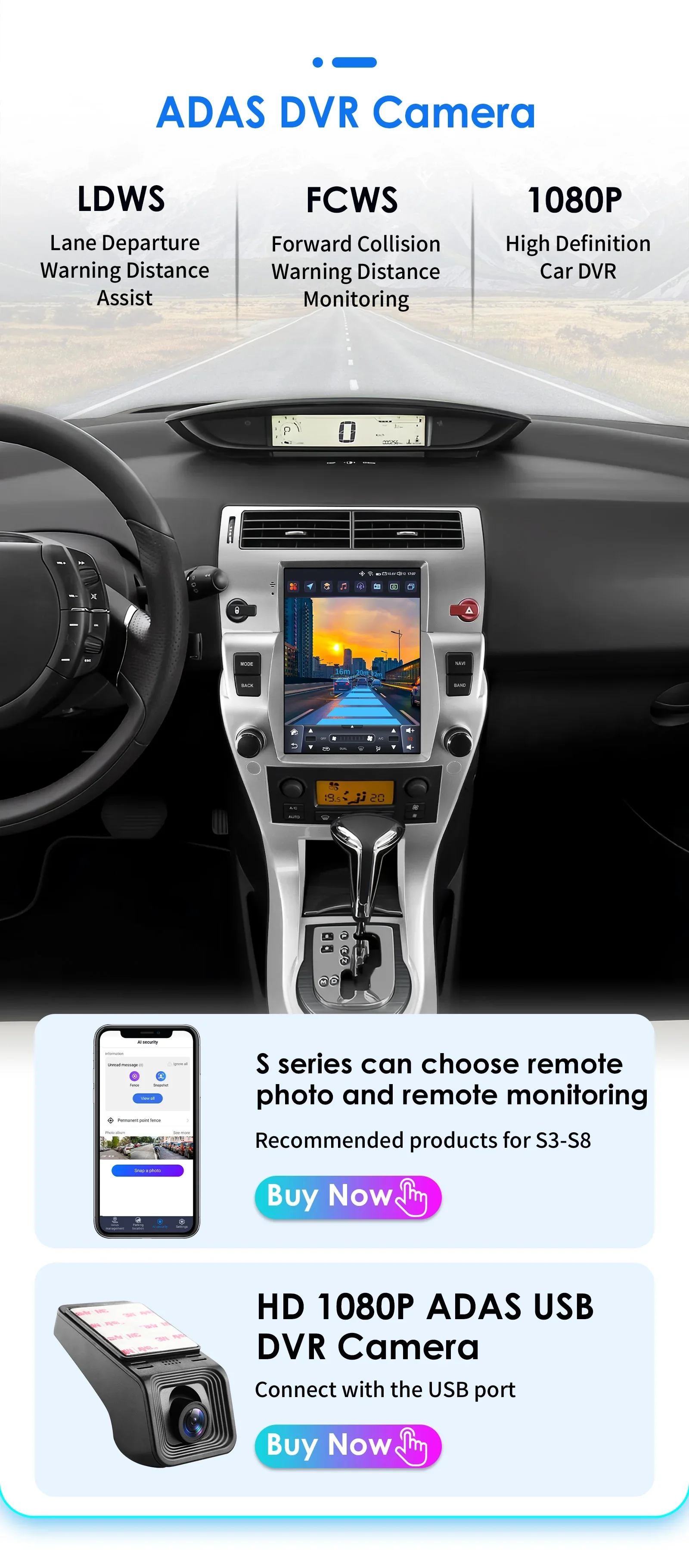 Telecamera DVR ADAS HD 1080P (da ordinare separatamente): da collegare alla porta USB: LDWS (Lane Departure Warning Distance), FCWS (Forward Collision Warning Distance), 1080P (High Definition Car DVR).