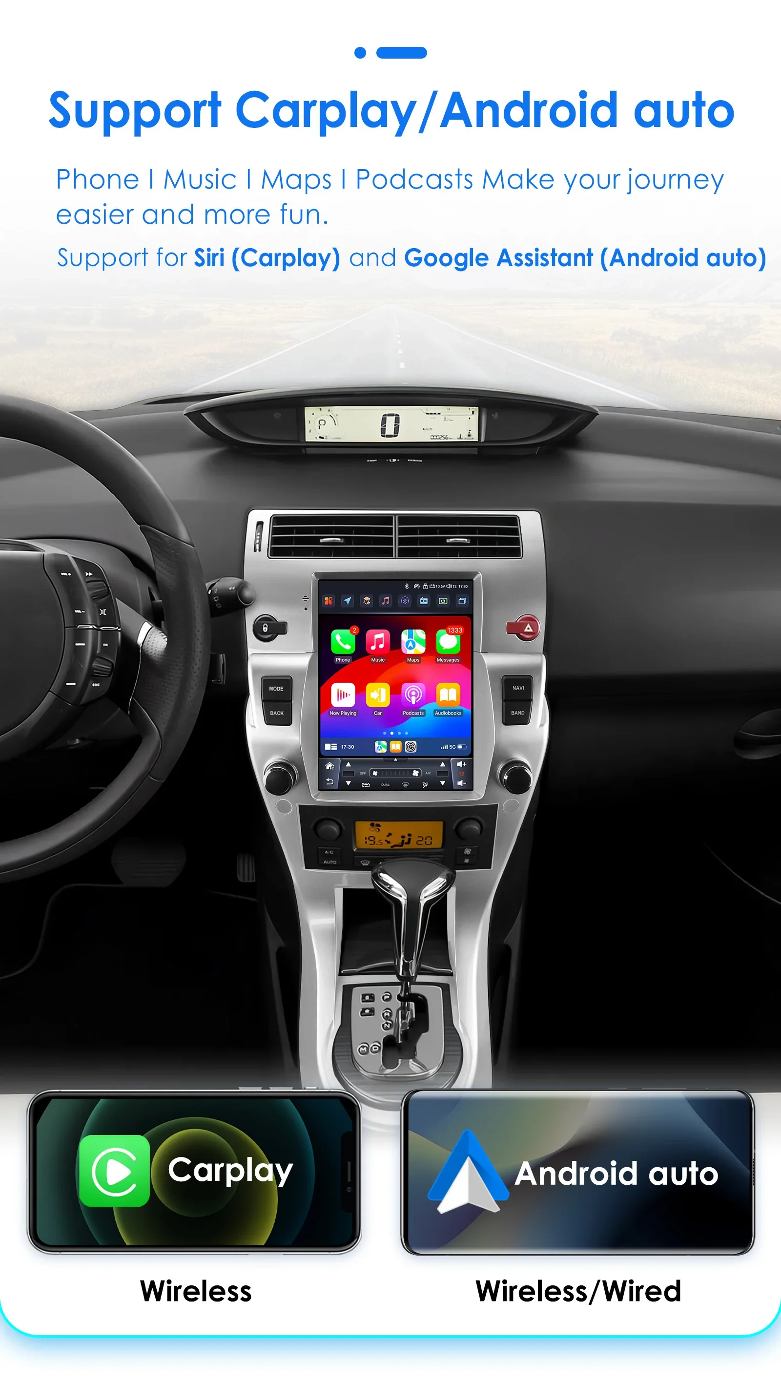 Supporta Carplay/Android auto: Telefono/Musica/Mappe/Podcast Rendi il tuo viaggio più facile e divertente. Supporta Carplay wireless, Android auto cablato, Android auto wireless (che deve impostare la banda AP dell'hotspot Wi-Fi del telefono cellulare come banda a 5 Ghz).