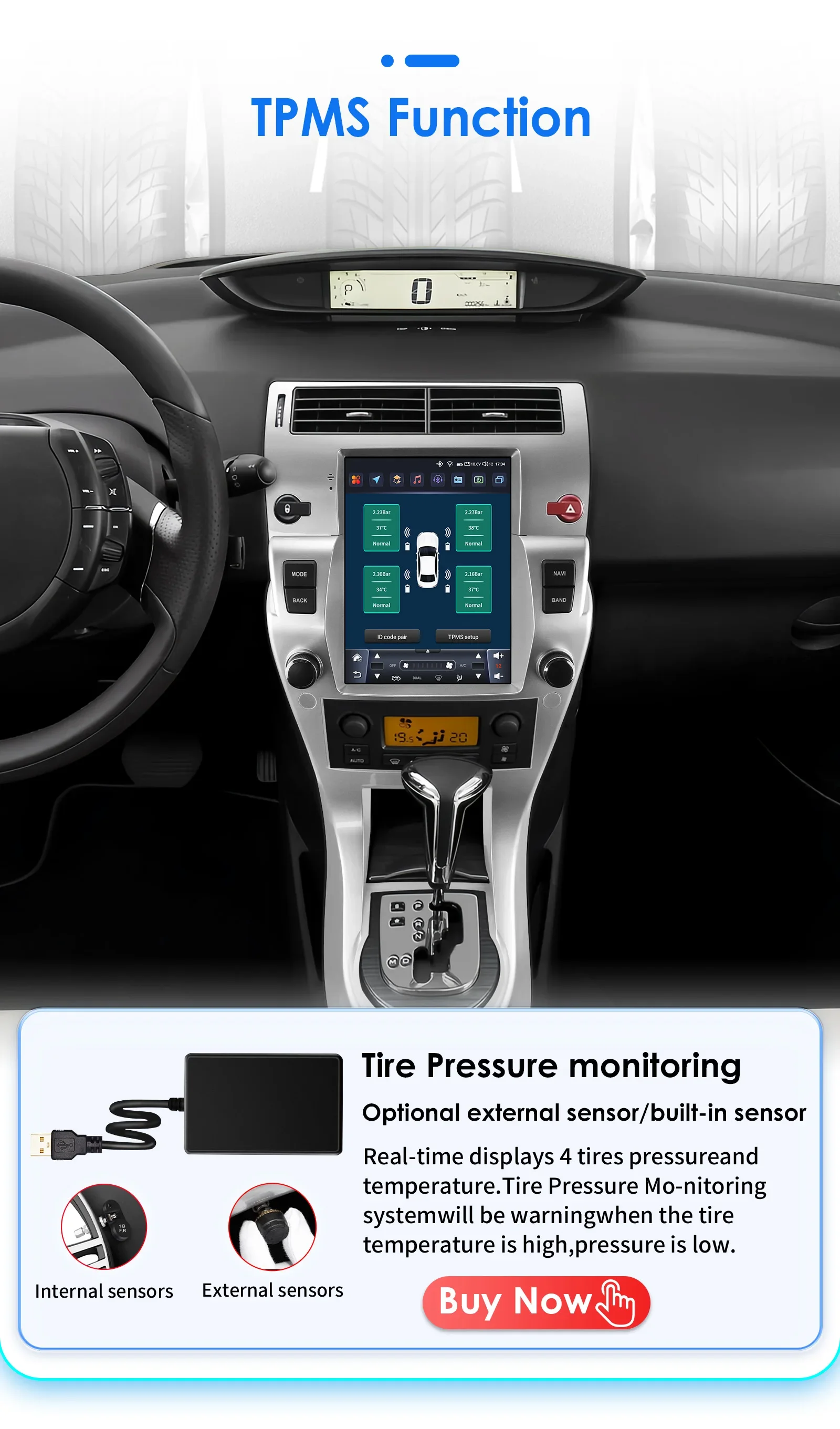 Funzione TPMS (da ordinare separatamente): monitoraggio della pressione dei pneumatici: visualizza in tempo reale la pressione e la temperatura dei 4 pneumatici, il sistema di monitoraggio della pressione dei pneumatici emette un avviso quando la temperatura dei pneumatici è alta o la pressione è bassa.