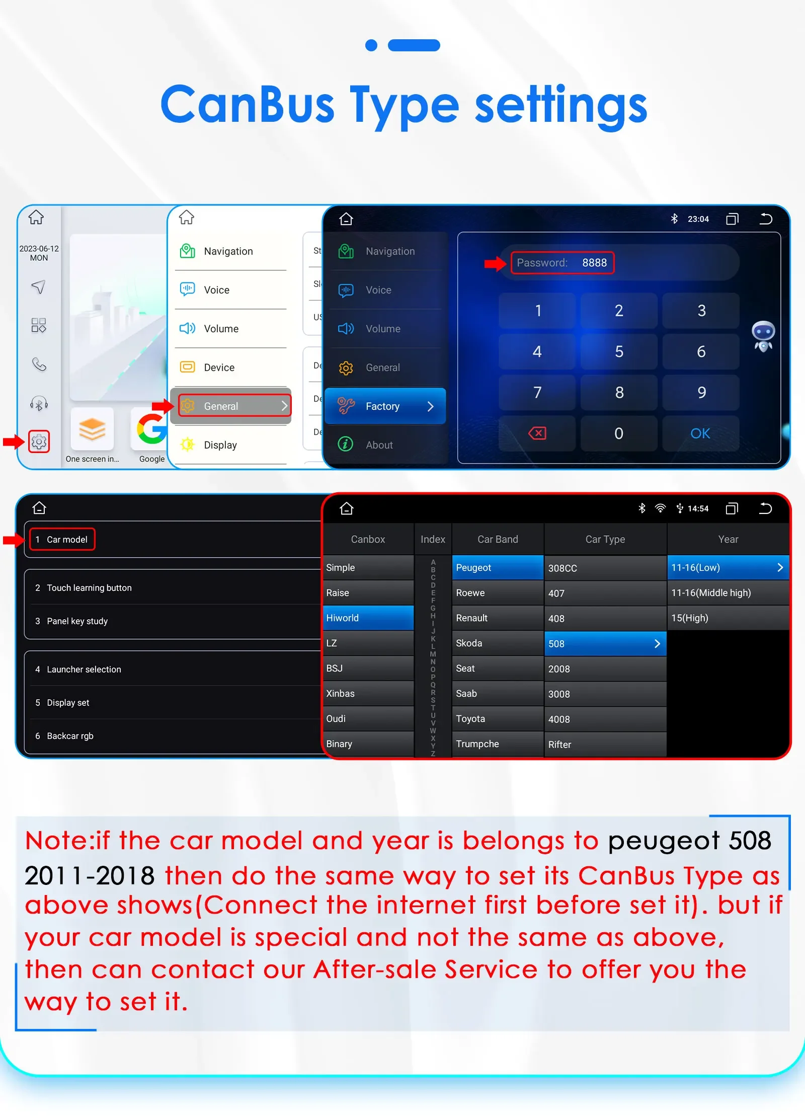 impostazioni tipo Canbus serie S: fabbrica - 8888 (password) - modello auto - Hiworld - Peugeot - 508 - 11-16 (basso) - ok.