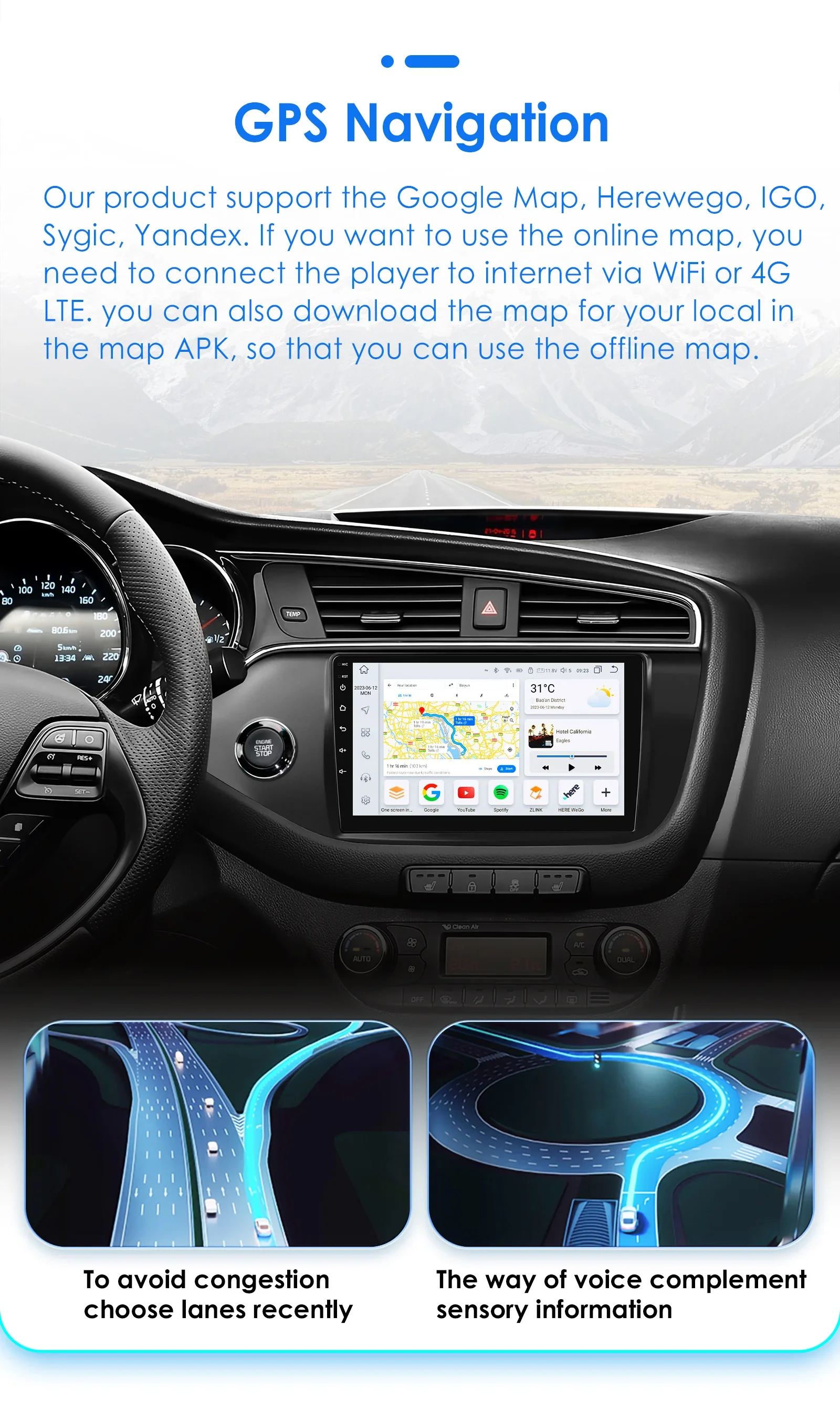 Navigazione GPS: supporta Google Maps online e offline, Navitel, Waze, Herewego Per evitare la congestione, scegli le corsie di recente, il modo in cui la voce completa le informazioni sensoriali. Supporta AV-OUT: scatola AV OUT (da ordinare separatamente)