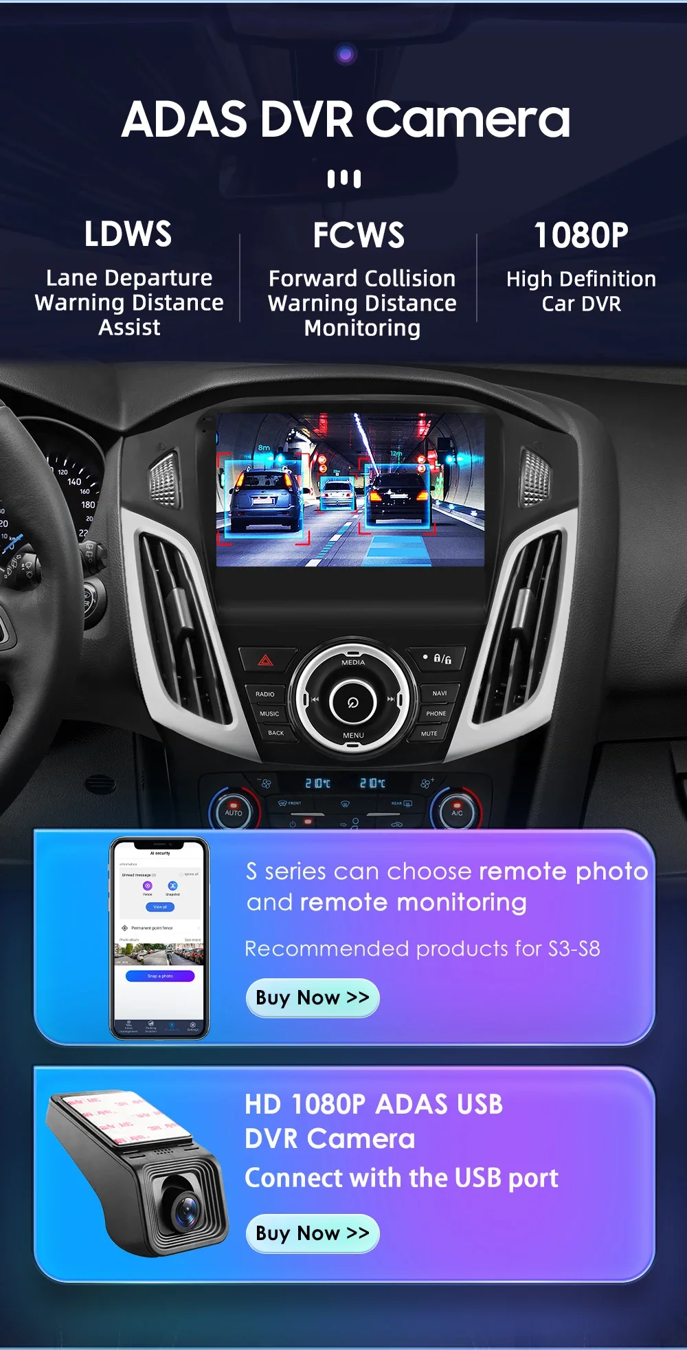 Telecamera DVR ADAS HD 1080P (da ordinare separatamente) -- collega alla porta USB: LDWS (Lane Departure Warning Distance), FCWS (Forward Collision Warning Distance), 1080P (High Definition Car DVR).
