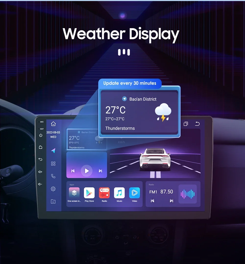 Navigation , Weather Display , Split Screen ,Bluetooth phone,Radio functions ,One key to enter the secondary page, Customizable application add,delete,move.