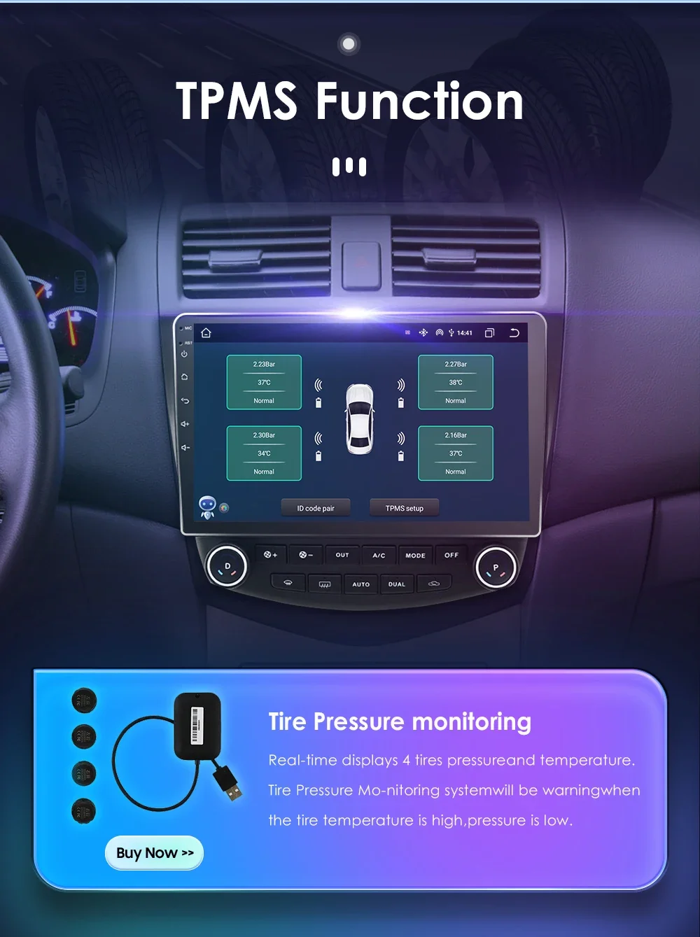Funzione TPMS (da ordinare separatamente): monitoraggio della pressione dei pneumatici: visualizza in tempo reale la pressione e la temperatura di 4 pneumatici, il sistema di monitoraggio della pressione dei pneumatici avvisa quando la temperatura dei pneumatici è alta o la pressione è bassa.