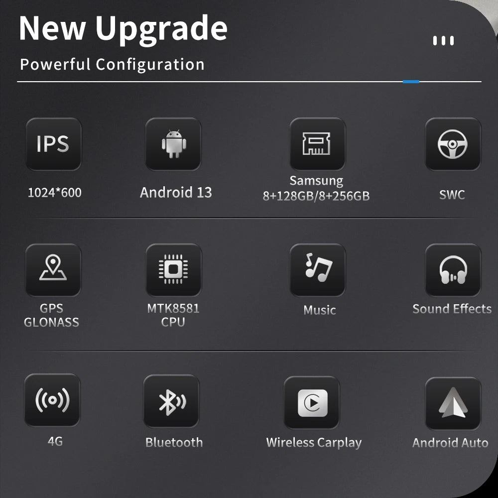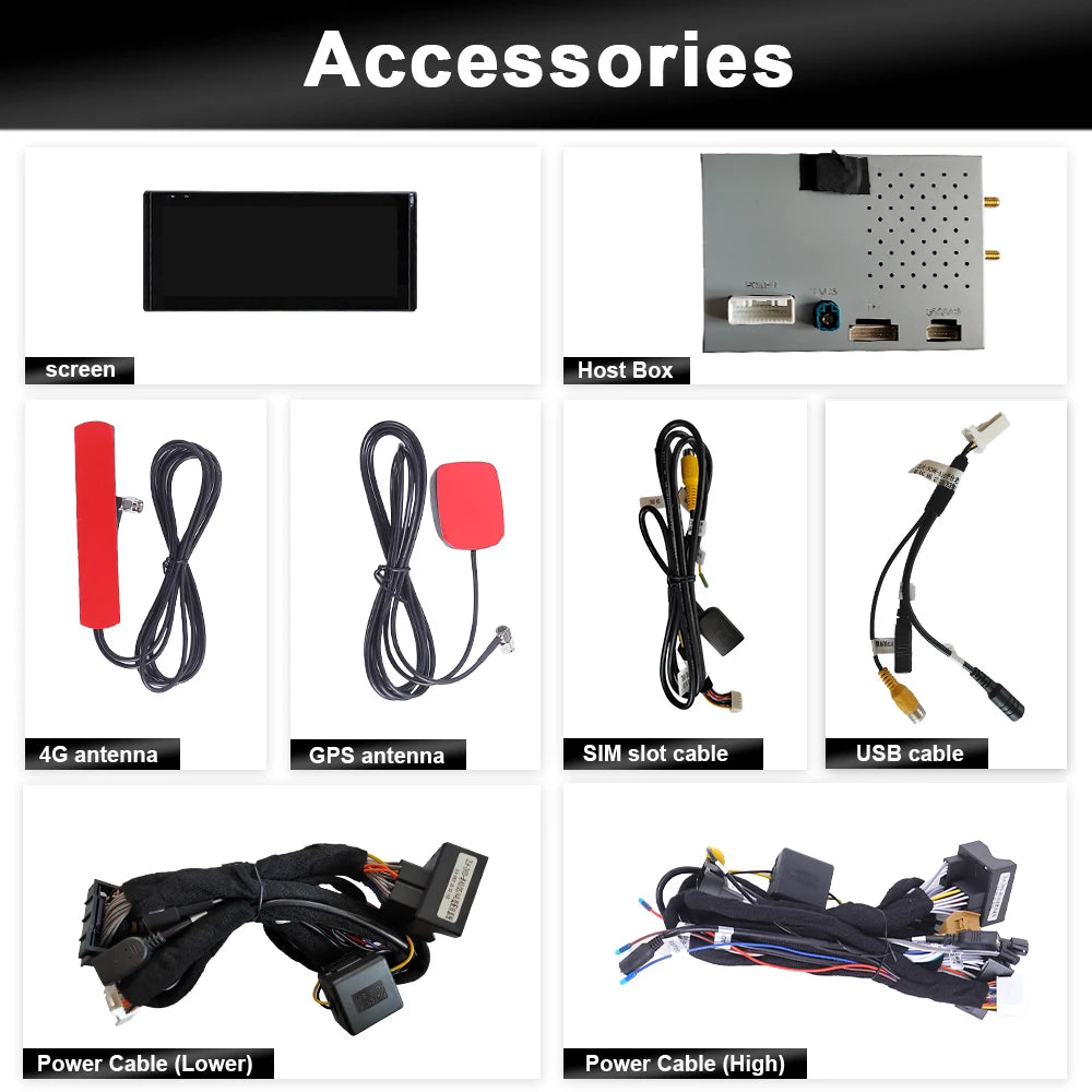 Funzione: Processore CPU 8 Core / GPS Navi / Google / WIFI / SIM 4G / BT / Wireless Carplay / Android Auto via cavo / USB / Musica / Video / Schermo diviso / Controllo del volante / Supporto telecamera posteriore / Mantieni la funzione originale dell'auto / Schermata di avvio rapido