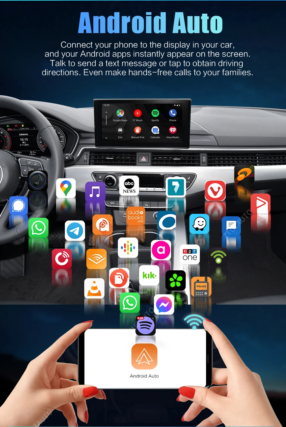🚘 【Android Auto wireless/cablato】 Collega semplicemente il tuo telefono in modalità wireless per usufruire delle funzioni Android Auto. Supporta l'accesso alla navigazione, ai contatti del telefono, alla musica, ecc. tramite Siri o Google Assistant per aiutarti a vivere un'esperienza di guida più intelligente e comoda mentre ti concentri sulla strada.