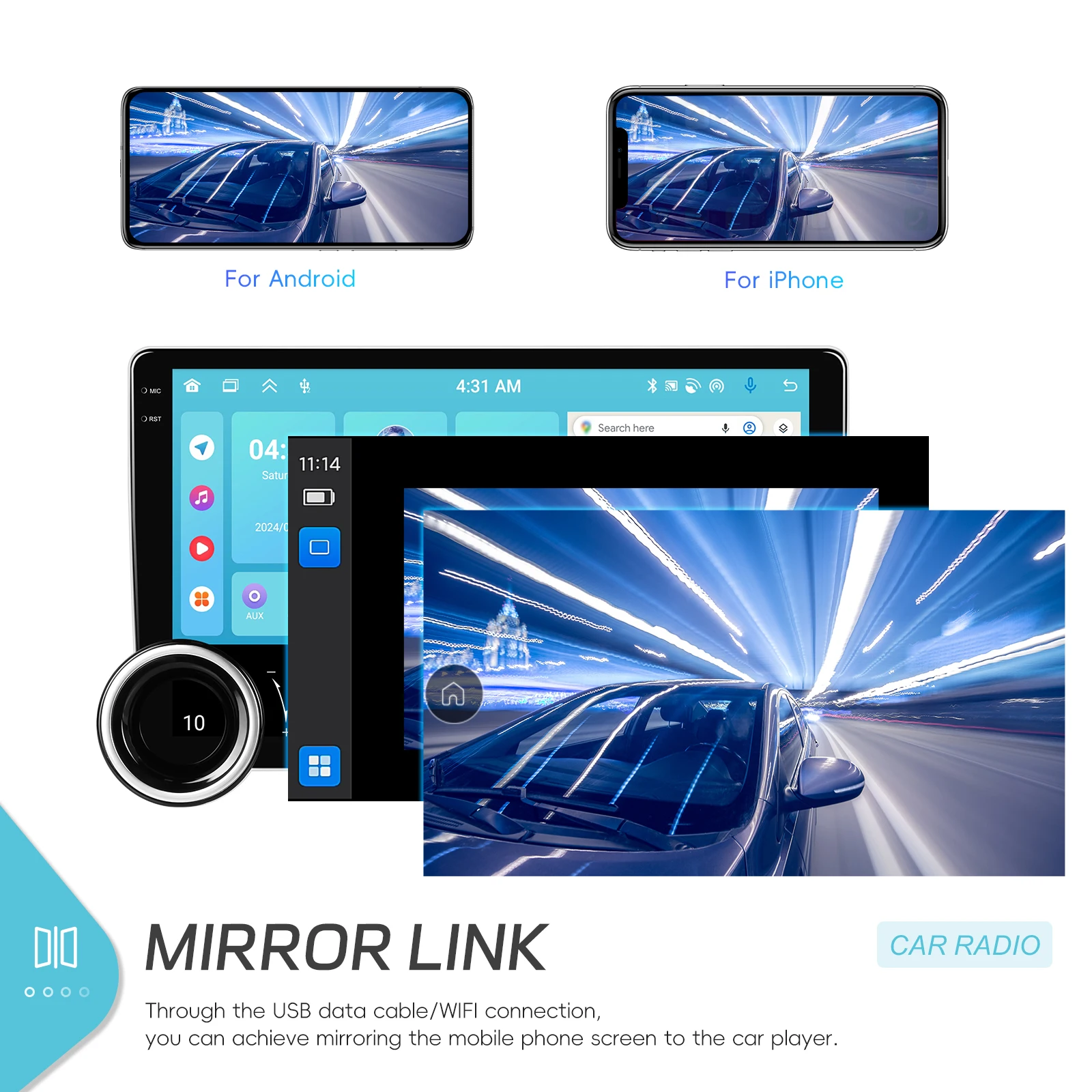 ● Mirroring link: collega il tuo smartphone al dispositivo tramite cavo USB o Wi-Fi e riproduci lo schermo del telefono sul display del dispositivo. Puoi utilizzare app, musica, video e altro ancora sul dispositivo.