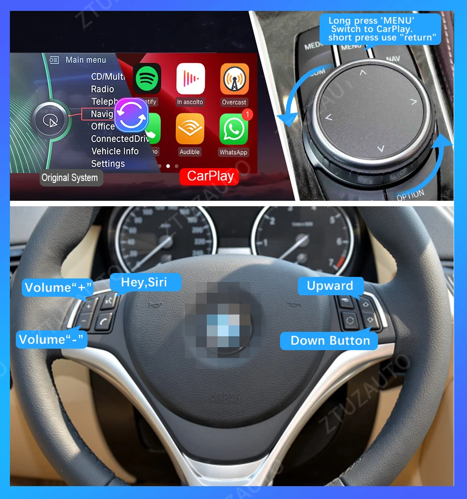 Plug and play del cavo originale dell'auto, nessun filo da tagliare. Non è necessario sostituire lo schermo di fabbrica per rendere la tua auto più intelligente. Questo fantastico kit aggiunge la piena funzionalità CarPlay al tuo sistema esistente mantenendo tutte le funzionalità del sistema originale. Il sistema CarPlay supporta il controllo tramite pulsanti e volante ed è integrato con la console o il vano portaoggetti USB.