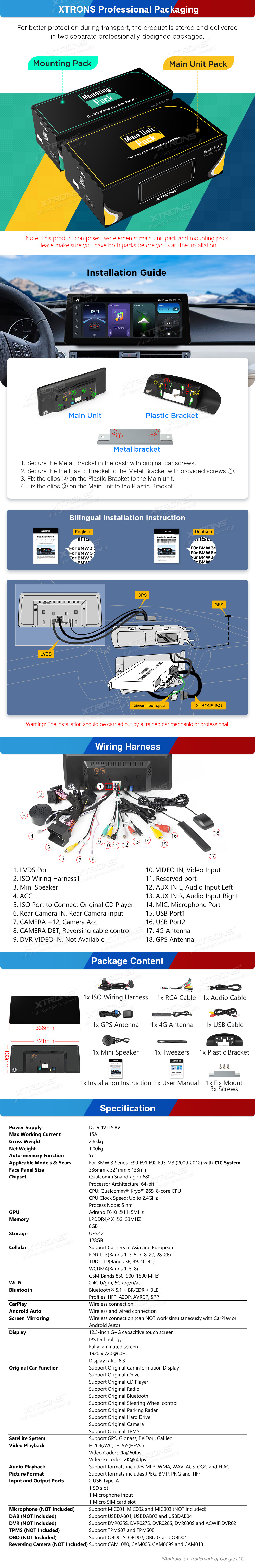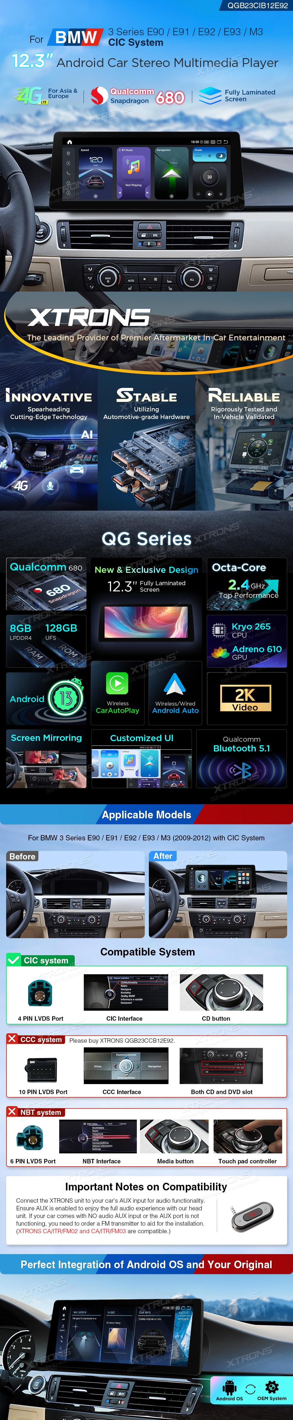 BMW 3 Series E90/91/92/93 M3 CCC/CIC 12.3'' Android 14 Octacore 8GB RAM +128GB CarPlay Android Auto wireless DSP 4G QGB23CIB12E92