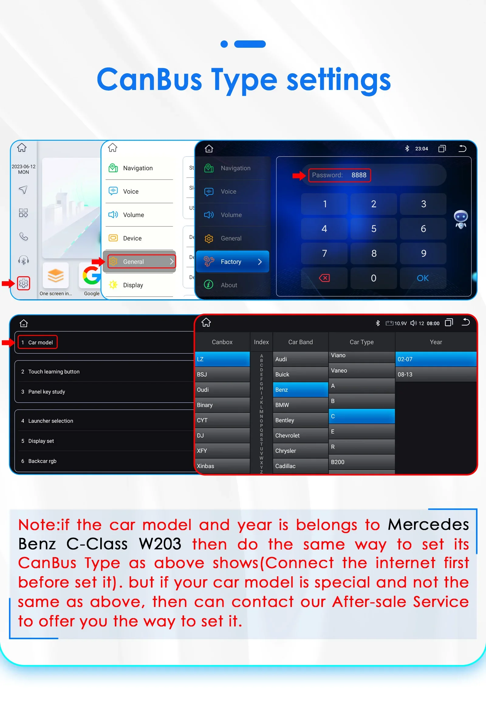 S seires Canbus Type settings: Factory--8888(Password)--Car Model--LZ--BZ--C--02-07--OK.