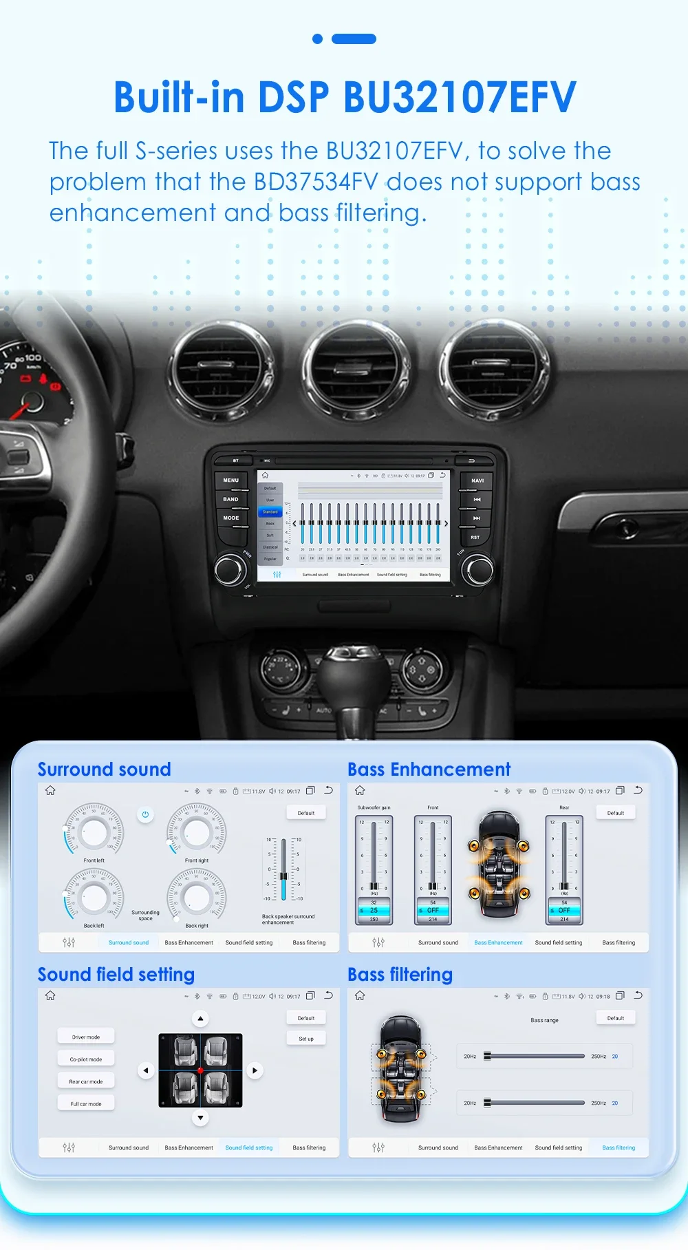 Built-in DSP BU32107EFV: We use BU32107EFV and BD37534FV DSP IC in different configurations products. The specifit difference please refer to the product configurations table.