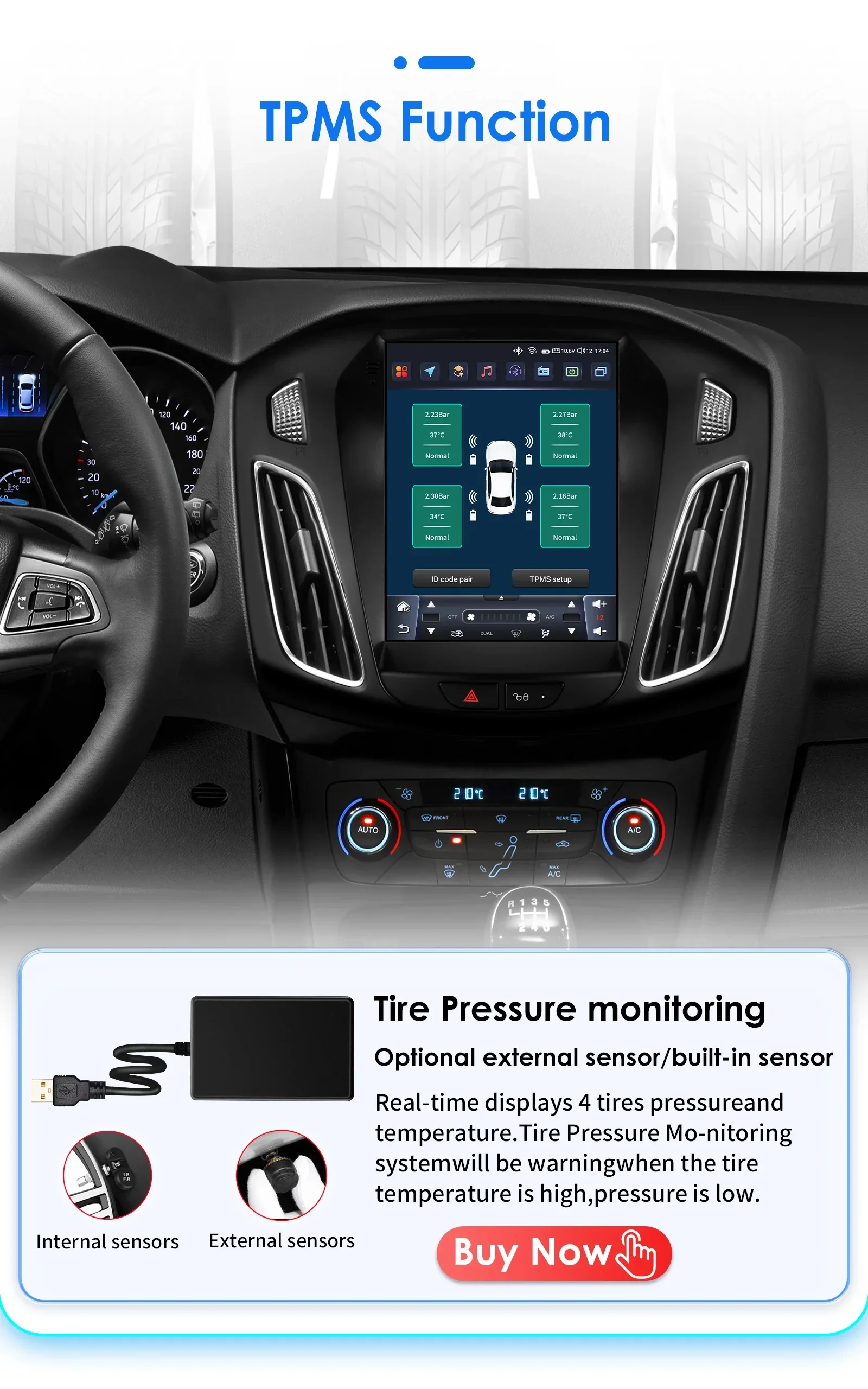 Funzione TPMS (da ordinare separatamente): monitoraggio della pressione dei pneumatici: visualizza in tempo reale la pressione e la temperatura dei 4 pneumatici, il sistema di monitoraggio della pressione dei pneumatici emette un avviso quando la temperatura dei pneumatici è alta o la pressione è bassa.