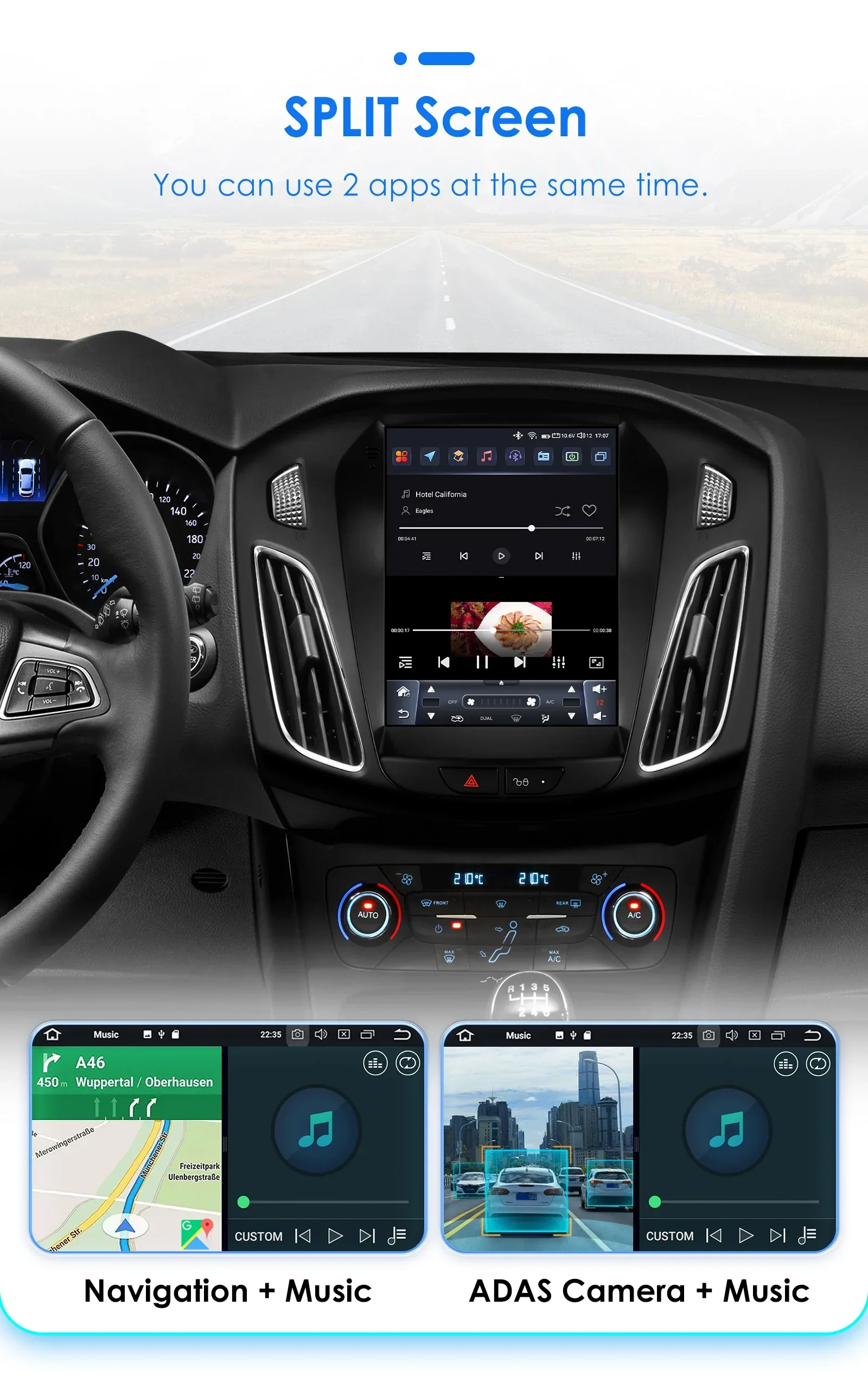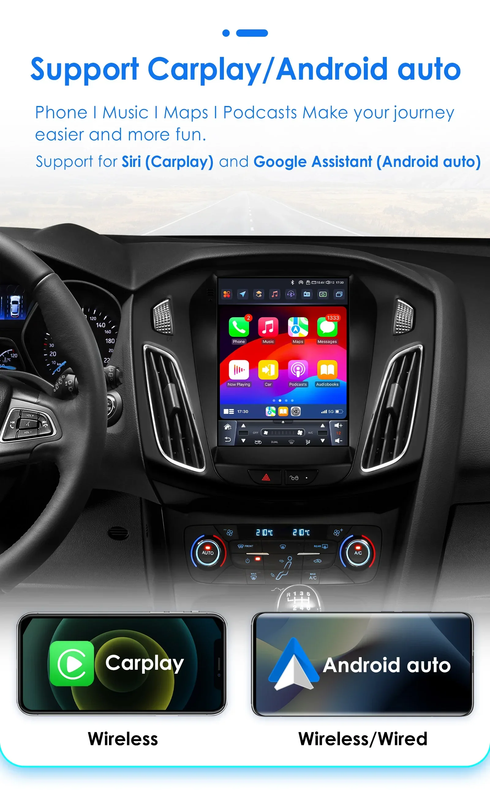 Support Carplay / Android auto: Phone / Music / Maps / Podcasts Make your journey easier and more fun. support wireless carplay,wired android auto,wireless android auto(which needs to set its cell phone wifi hotspot's AP Band as 5 Ghz band).