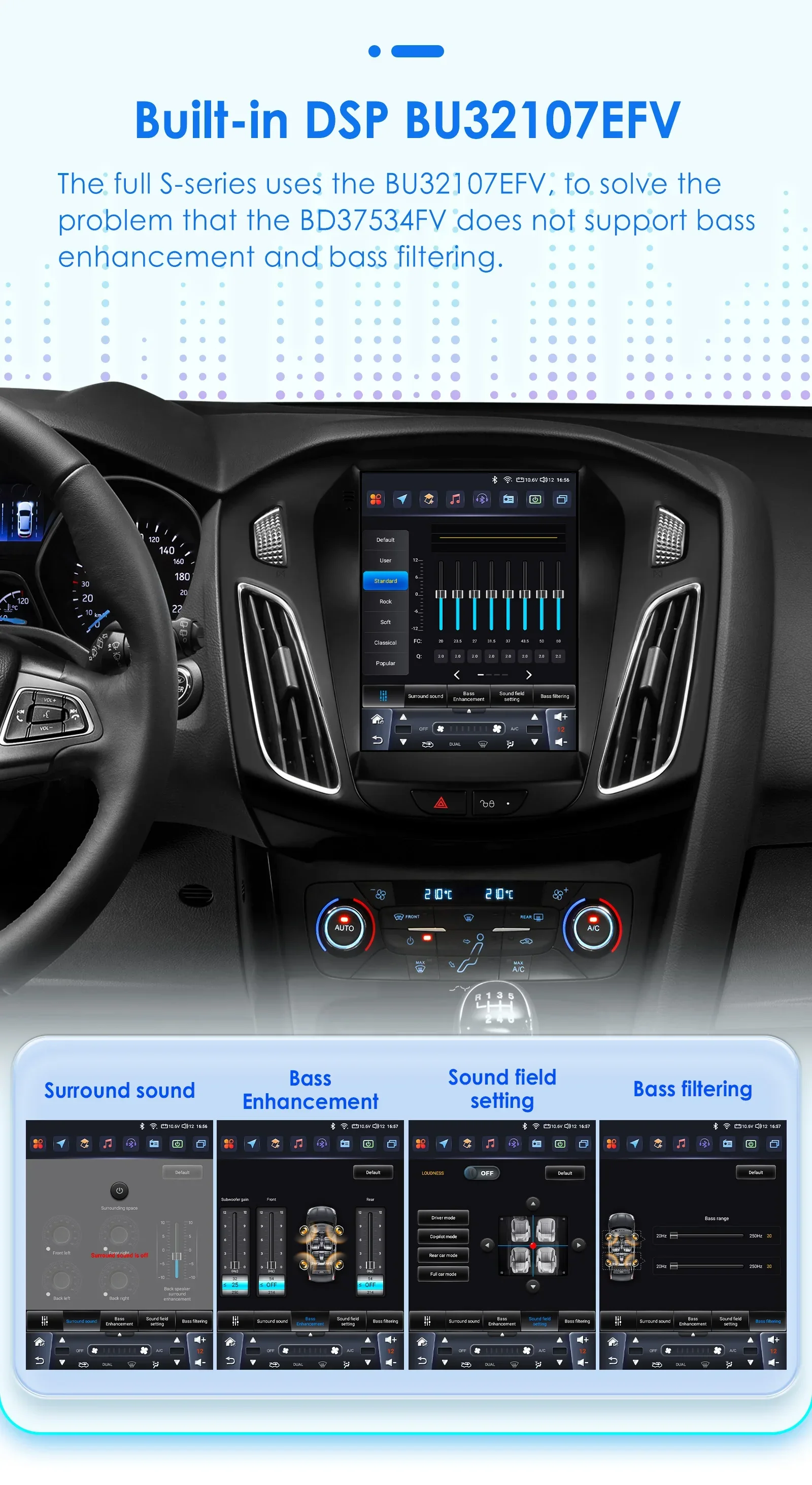 Built-in DSP BU32107EFV: We use BU32107EFV and BD37534FV DSP IC in different configurations products. The specifit difference please refer to the product configurations table.