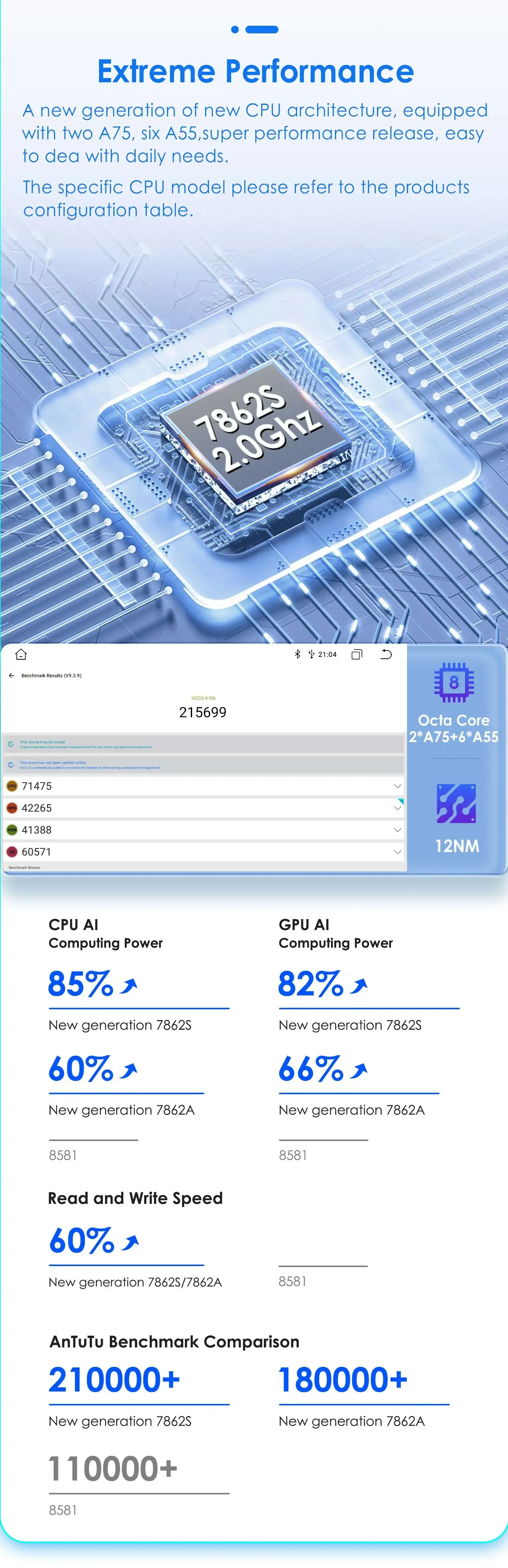 Prestazioni estreme: una nuova generazione di nuova architettura CPU, dotata di due A75, sei A55, versione ad alte prestazioni, facile da gestire per le esigenze quotidiane. Per il modello di CPU specifico, fare riferimento alla tabella di configurazione dei prodotti. 7862A 1,8 Ghz.