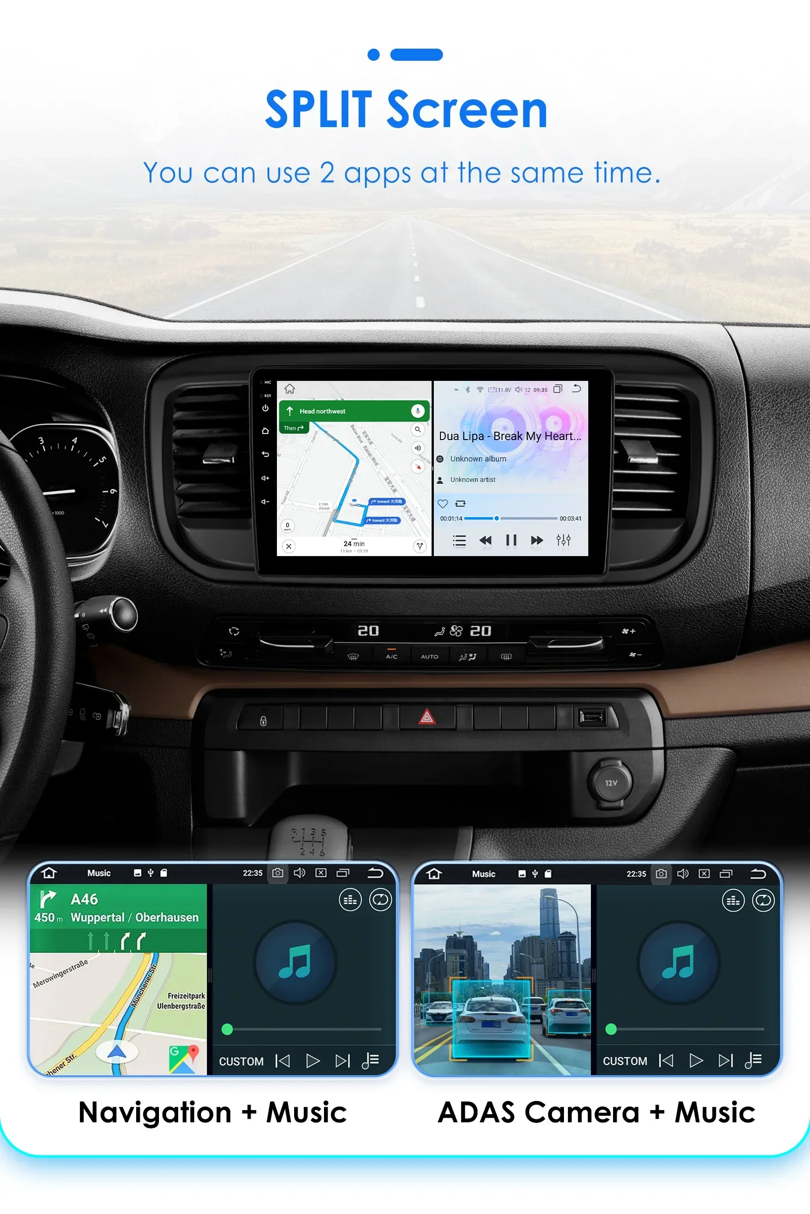 Split Screen : You can use 2 apps at the same time (such as: Navigation + Music , ADAS Camera + Music ,etc.)