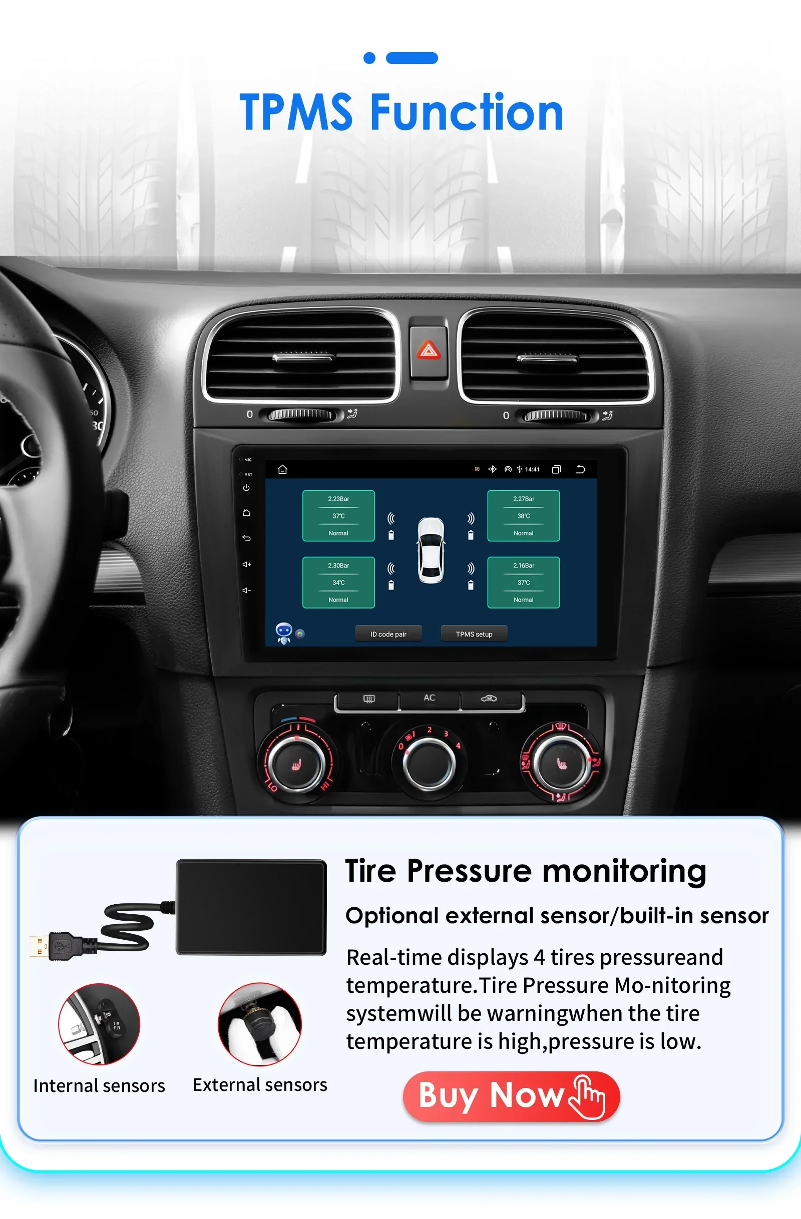 DAB+ Box (da ordinare separatamente): questa radio è dotata di un'APP per il lettore DAB, basta collegarla a un DAB+BOX tramite porta USB per utilizzare la funzione DAB+, supporta l'ingresso di programmi radio digitali e il funzionamento touch. È possibile utilizzare il touch screen dell'unità per cercare e cambiare programma e questa unità può alimentare il DAB+BOX collegato. Funzione TPMS (da ordinare separatamente): monitoraggio della pressione dei pneumatici: visualizza in tempo reale la pressione e la temperatura dei 4 pneumatici, il sistema di monitoraggio della pressione dei pneumatici emette un avviso quando la temperatura dei pneumatici è alta o la pressione è bassa.