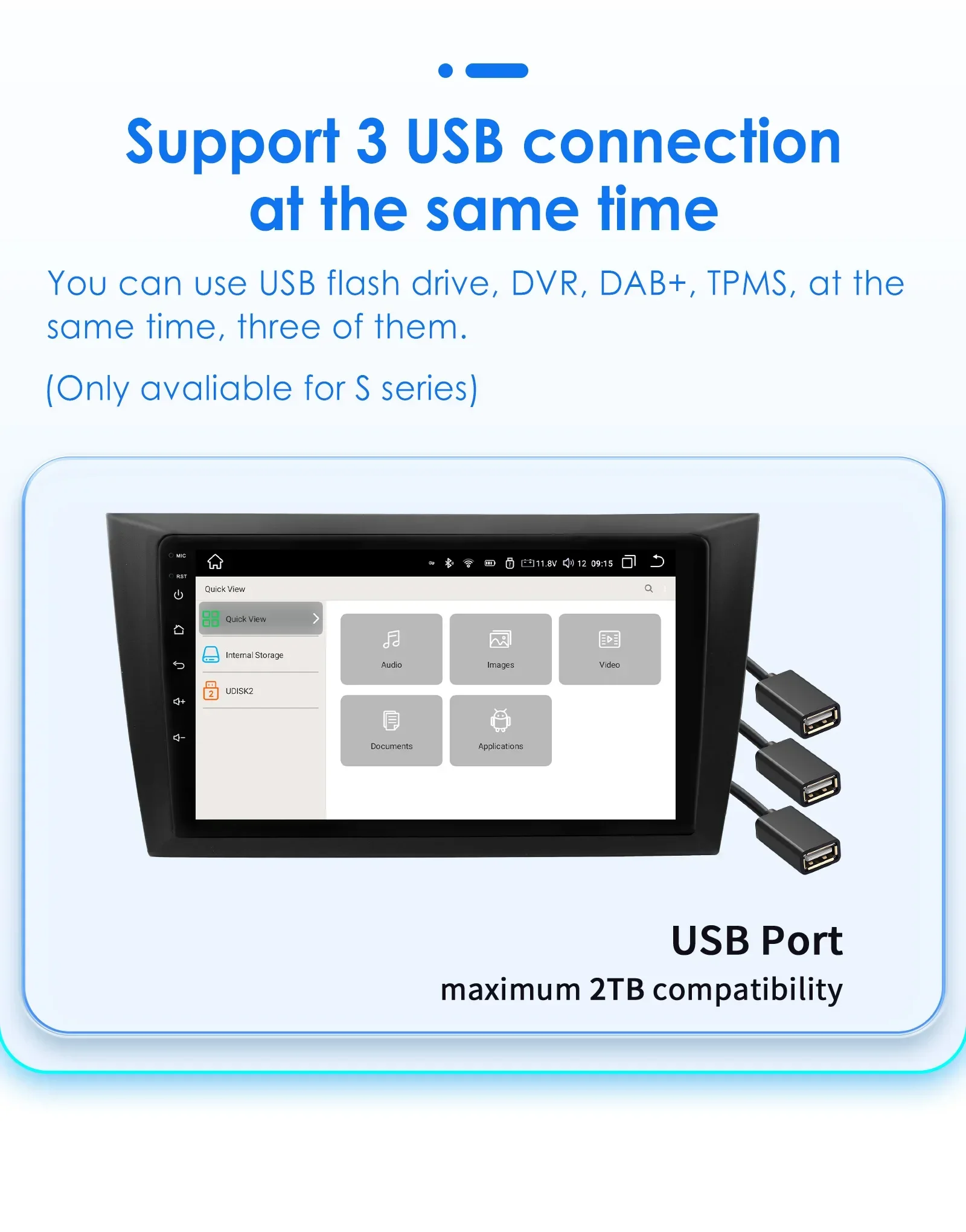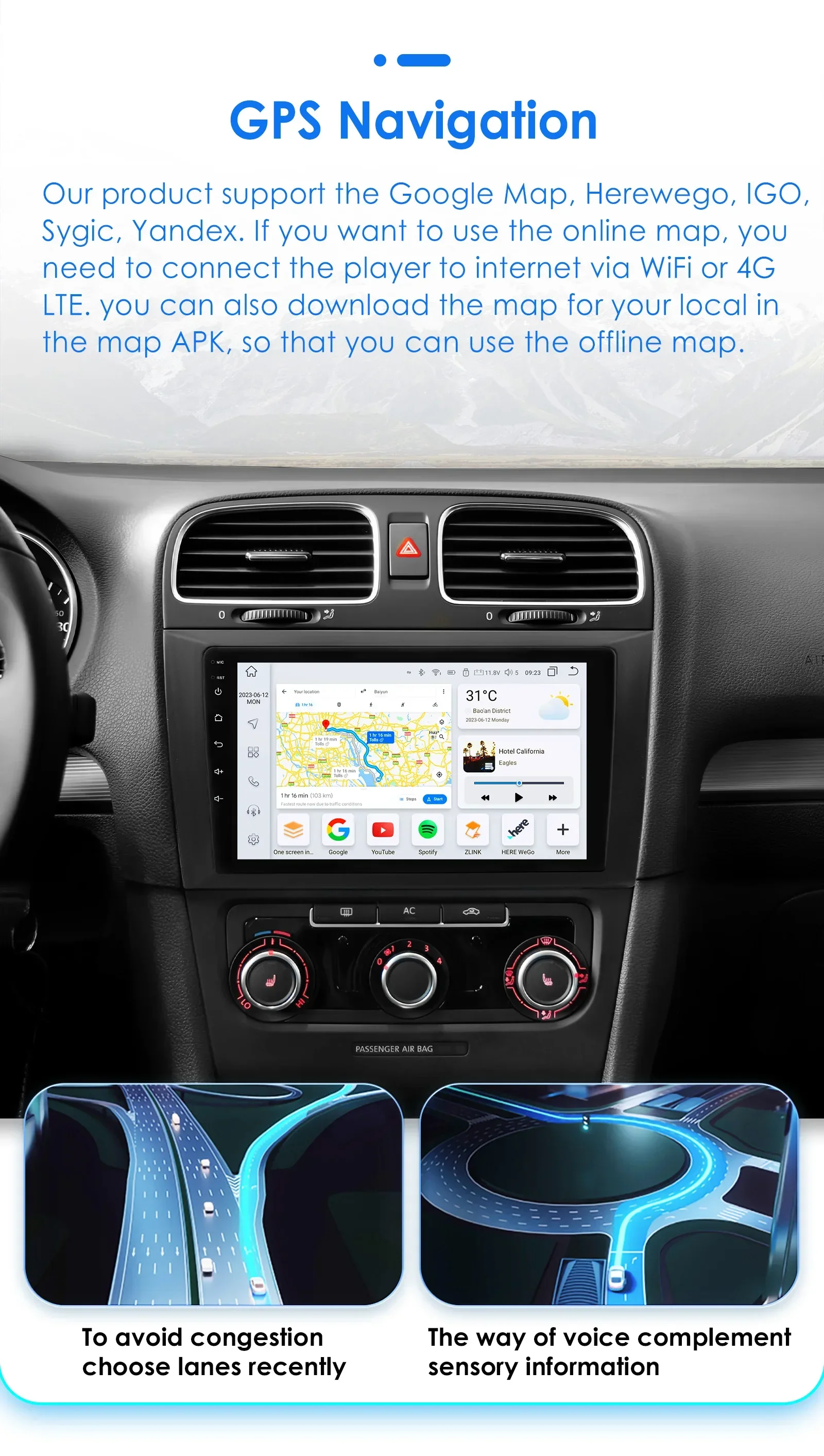 Piccola ventola di raffreddamento: Nota: la serie S 8Core è completamente inclusa. Gli articoli 4Core non includono la ventola e non supportano questa funzione. Navigazione GPS: supporta Google Maps online e offline, Navitel, Waze, Herewego Per evitare la congestione, scegli le corsie di recente, il modo in cui la voce completa le informazioni sensoriali. Supporta AV-OUT: scatola AV OUT (da ordinare separatamente) La serie S supporta 3 connessioni USB: memoria esterna: porta USB fino a 2 TB, questa unità può riprodurre file video e audio dal dispositivo esterno. Schermo diviso: puoi usare 2 app contemporaneamente (come: navigazione + musica, telecamera ADAS + musica, ecc.)