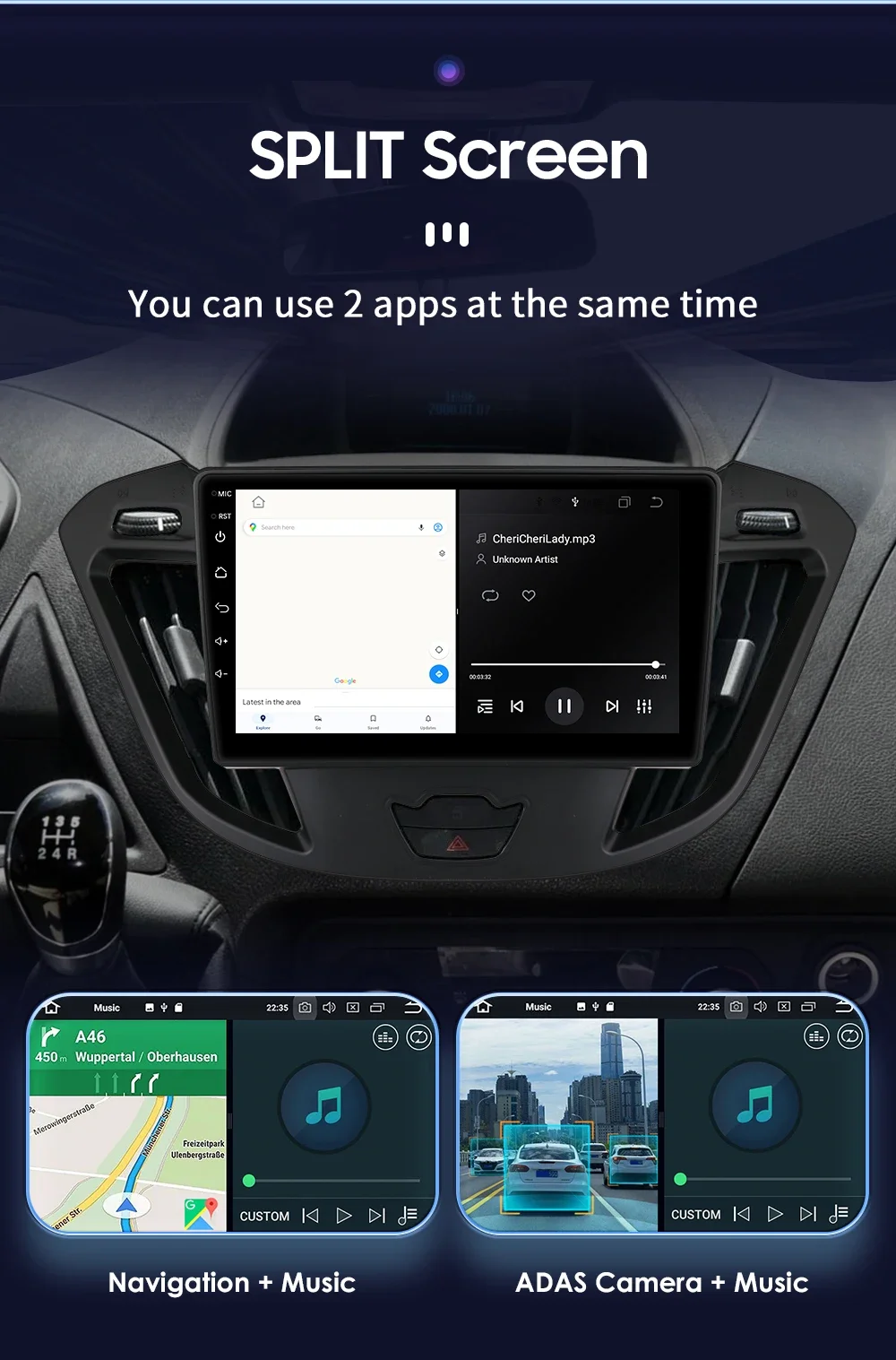 Supporta AV-OUT: AV OUT box (da ordinare separatamente) Schermo diviso: puoi usare 2 app contemporaneamente (come: Navigazione + Musica, Telecamera ADAS + Musica, ecc.)
