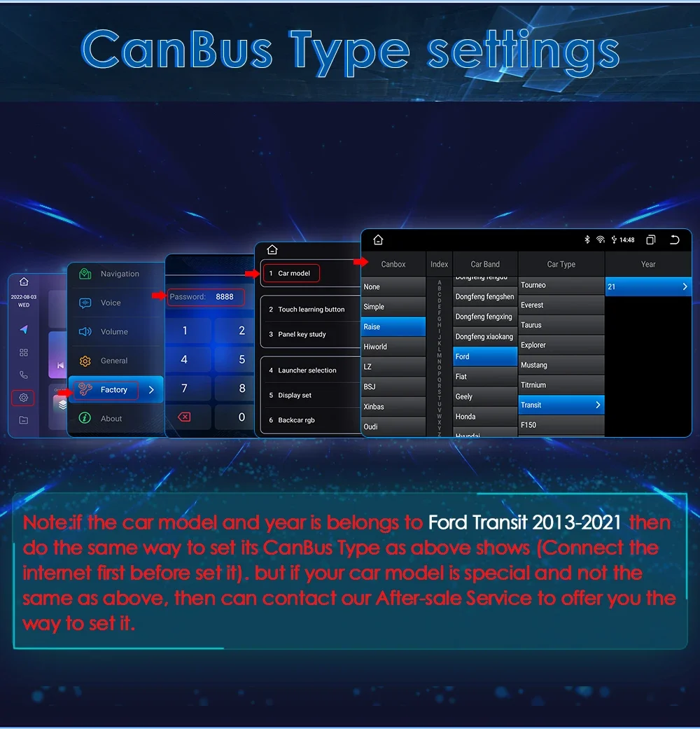 impostazioni tipo Canbus: fabbrica - 8888 - modello auto - aumento - Ford - Transit - 21 - ok.