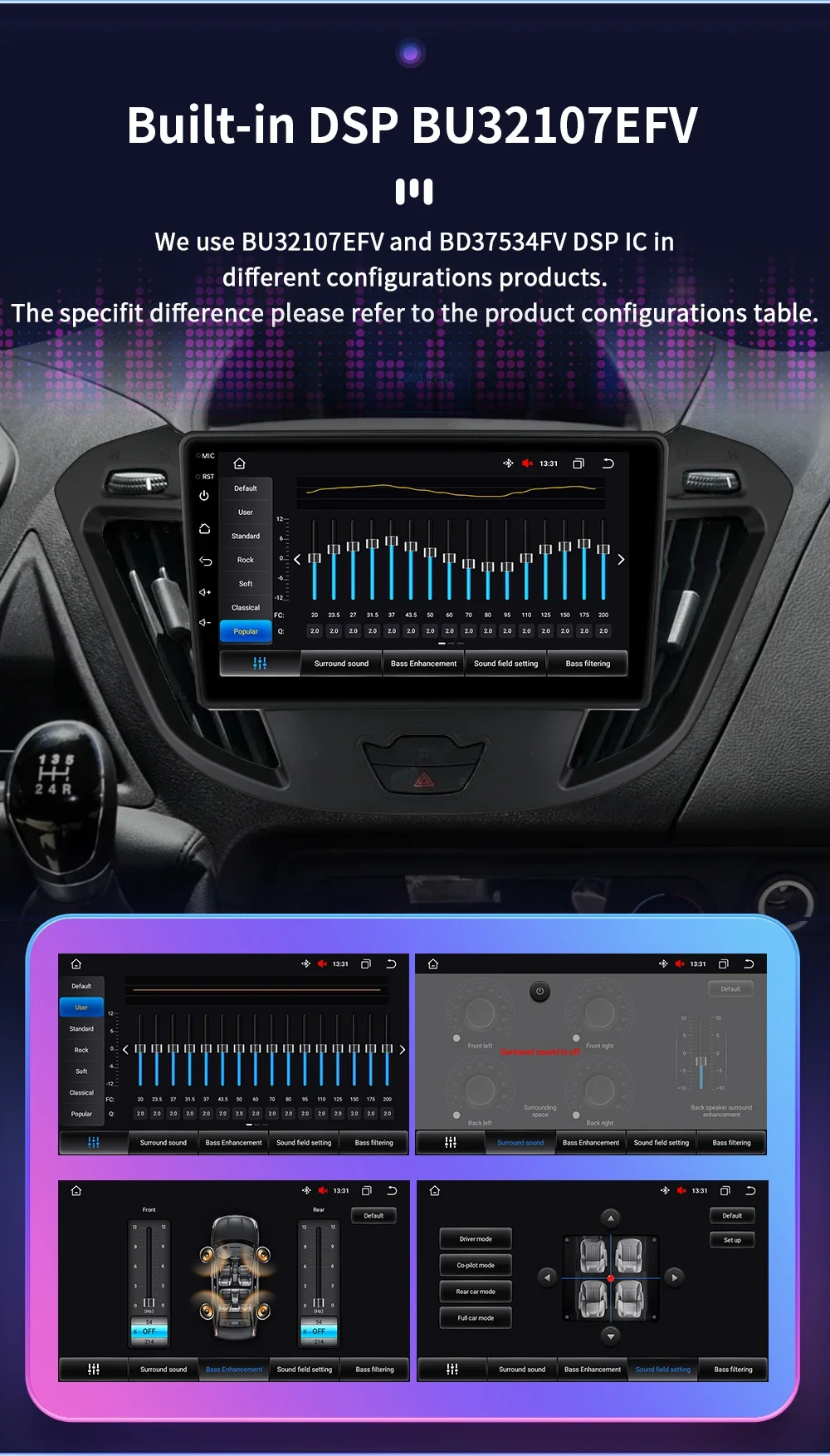 Built-in DSP BU32107EFV: We use BU32107EFV and BD37534FV DSP IC in different configurations products. The specifit difference please refer to the product configurations table.