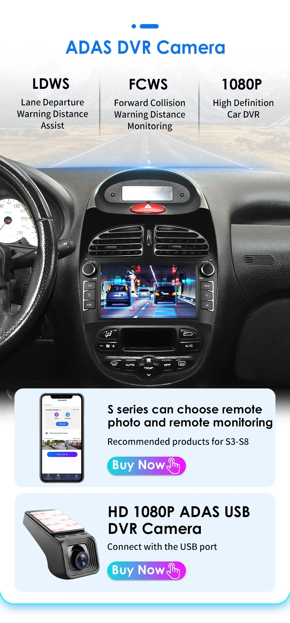 Telecamera DVR ADAS HD 1080P (da ordinare separatamente) -- collega alla porta USB: LDWS (Lane Departure Warning Distance), FCWS (Forward Collision Warning Distance), 1080P (High Definition Car DVR).