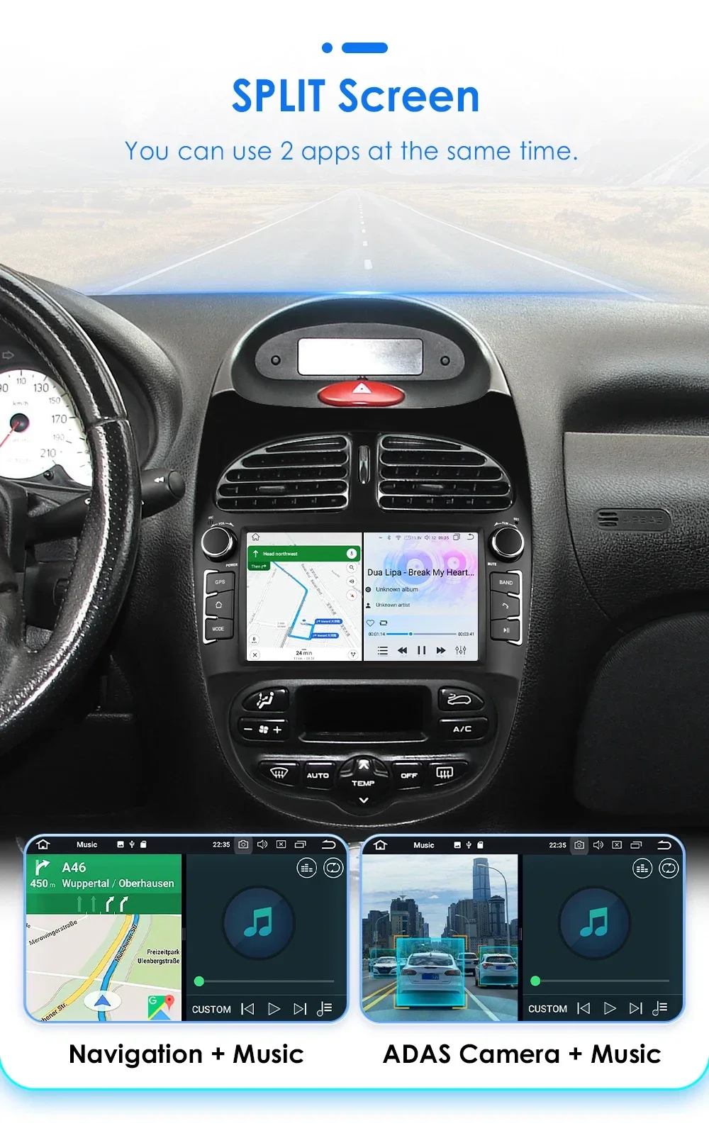 Schermo diviso: puoi usare 2 app contemporaneamente (come: Navigazione + Musica, Telecamera ADAS + Musica, ecc.)
