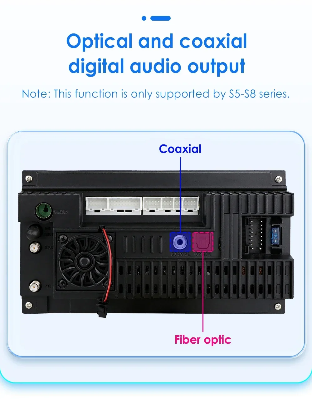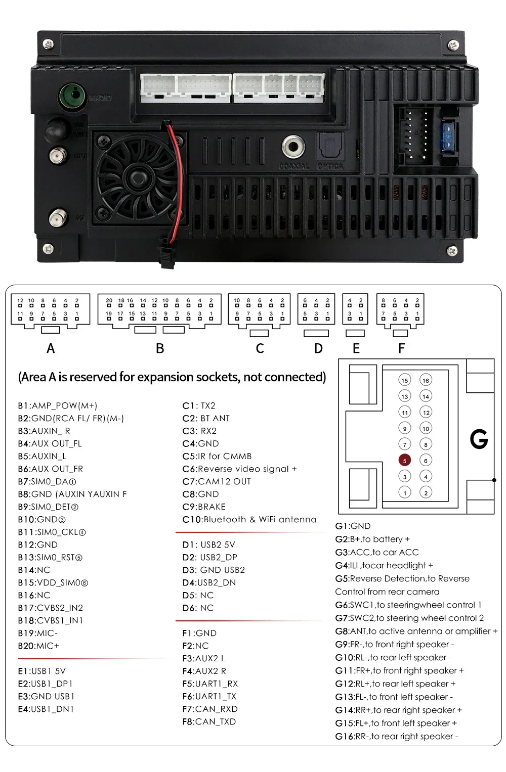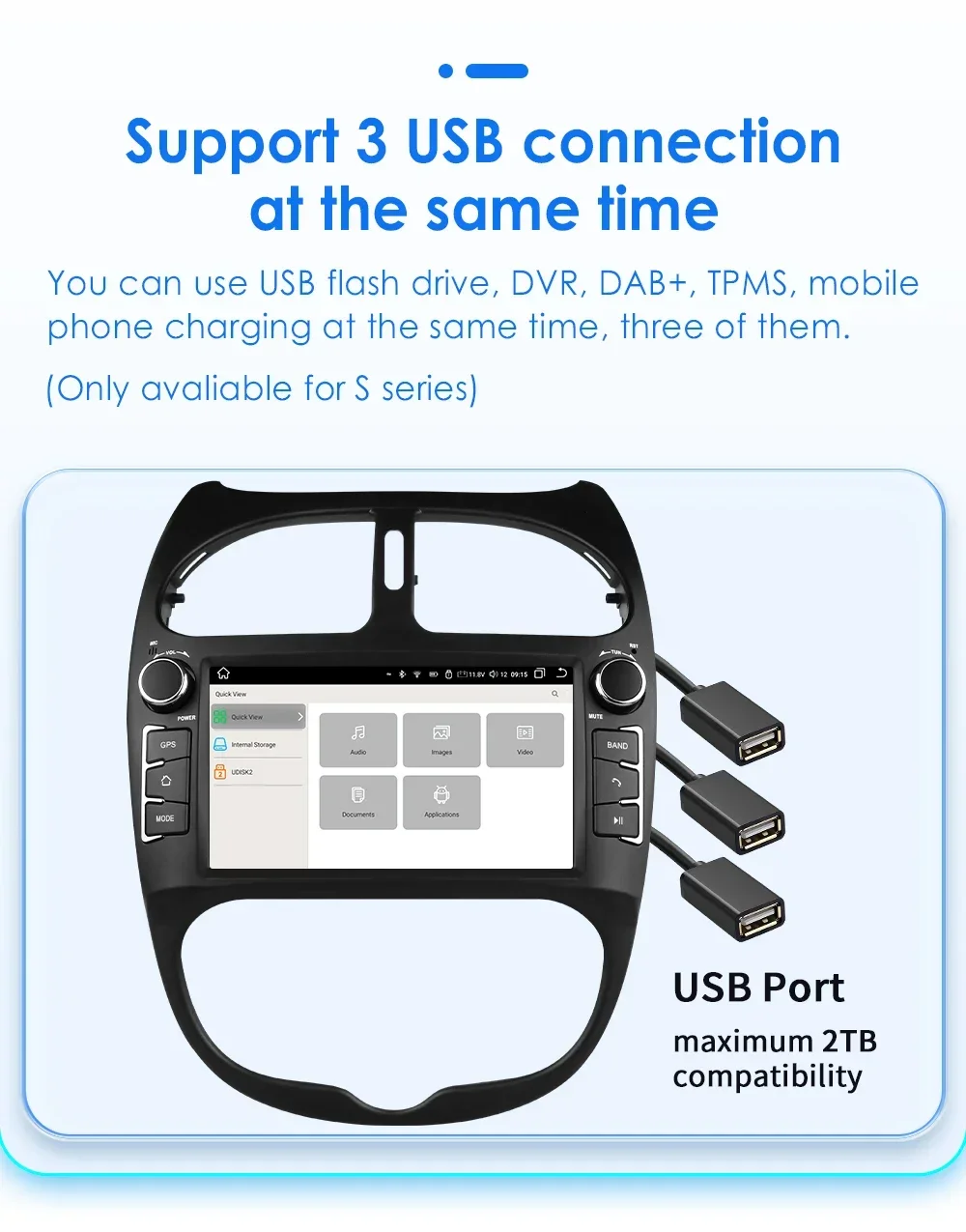 DAB+ Box (da ordinare separatamente): questa radio è dotata di un'APP per il lettore DAB, basta collegarla a un DAB+BOX tramite la porta USB per utilizzare la funzione DAB+, supporta l'ingresso di programmi radio digitali e il funzionamento touch. È possibile utilizzare il touch screen dell'unità per cercare e cambiare programma e questa unità può alimentare il DAB+ BOX collegato.