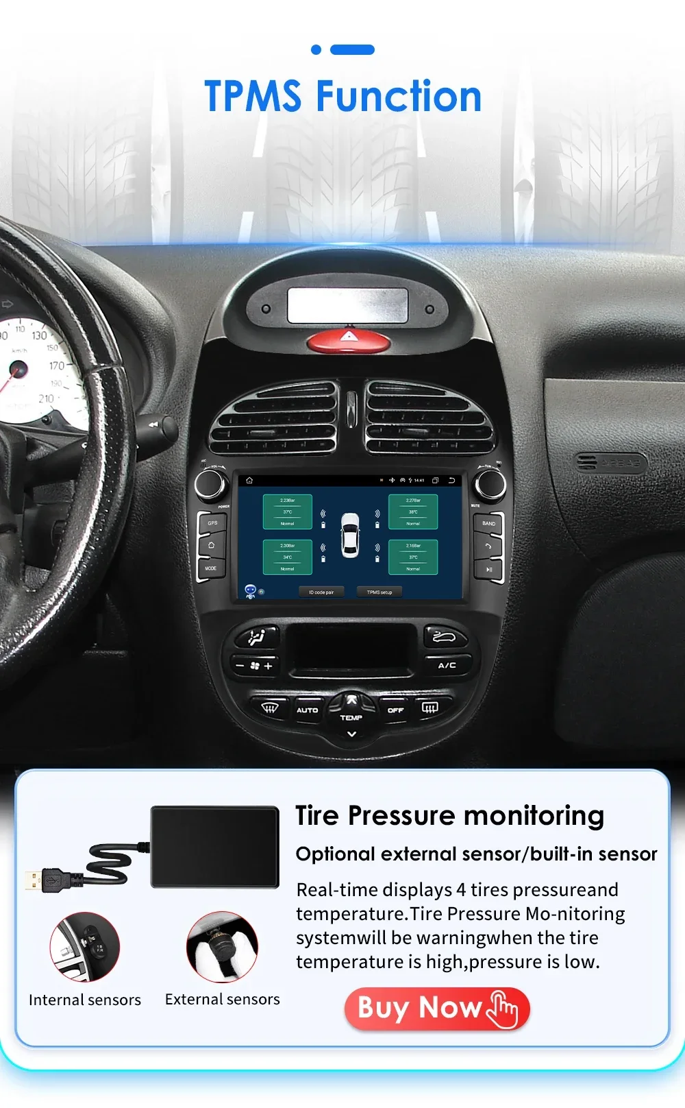 Funzione TPMS (da ordinare separatamente): monitoraggio della pressione dei pneumatici: visualizza in tempo reale la pressione e la temperatura di 4 pneumatici, il sistema di monitoraggio della pressione dei pneumatici avvisa quando la temperatura dei pneumatici è alta o la pressione è bassa.
